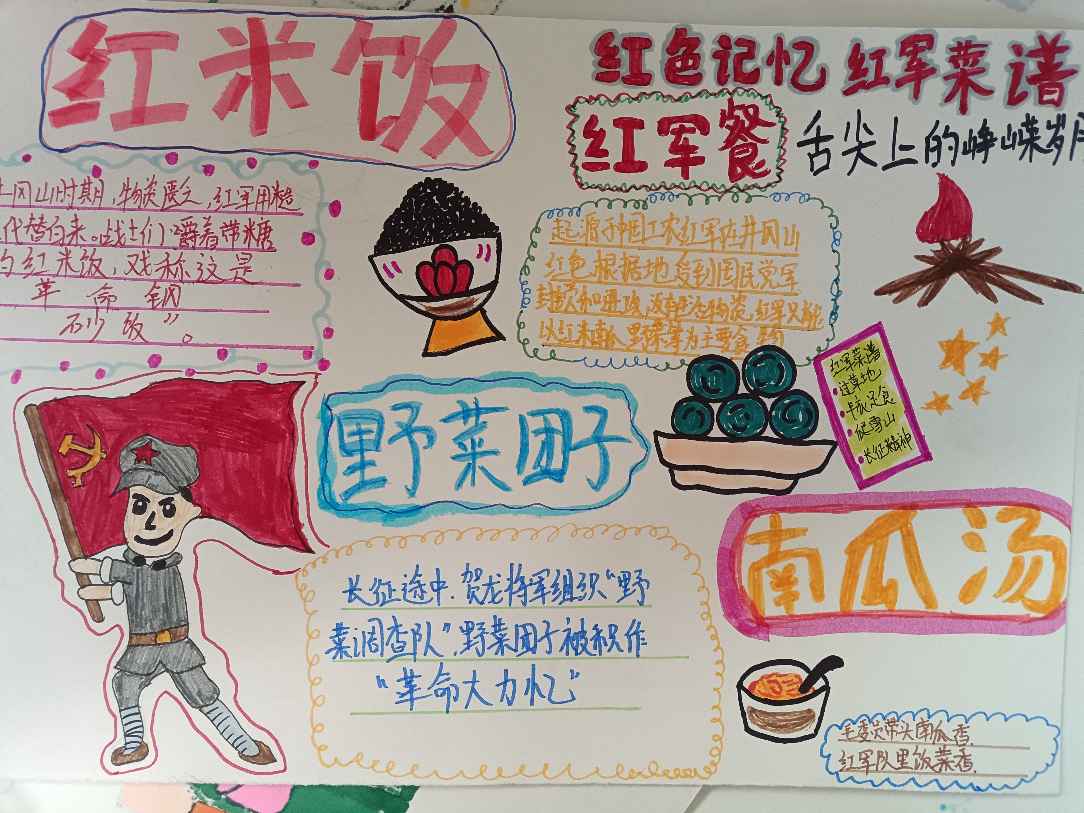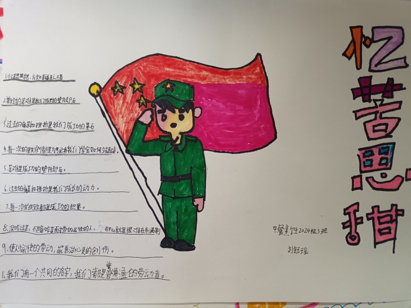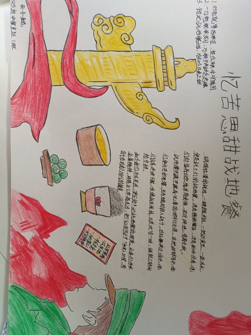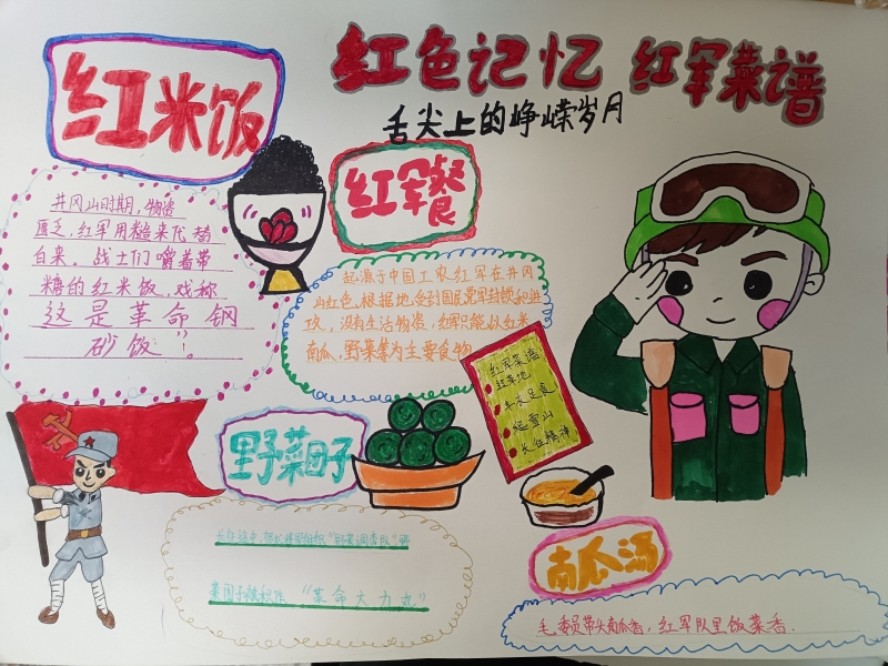 活动前期,中餐烹饪教育组教师进行了史料讲解、战地餐故事分享,雪水拌炒面、野菜团子、冻土豆,每一种战地餐背后都是战士们保家卫国的坚守。随后,学生们结合所学的烹饪专业知识与红色历史,以“战地餐”为核心主题创作手抄报:有的用细腻笔触还原战壕里的简易炊事场景,有的以文字记录战地餐背后的英雄事迹,还有的将战地餐食材如炒面、冻土豆图案与现代美食对比,直观呈现“苦与甜”的深刻内涵。