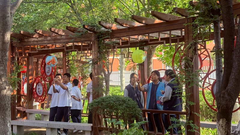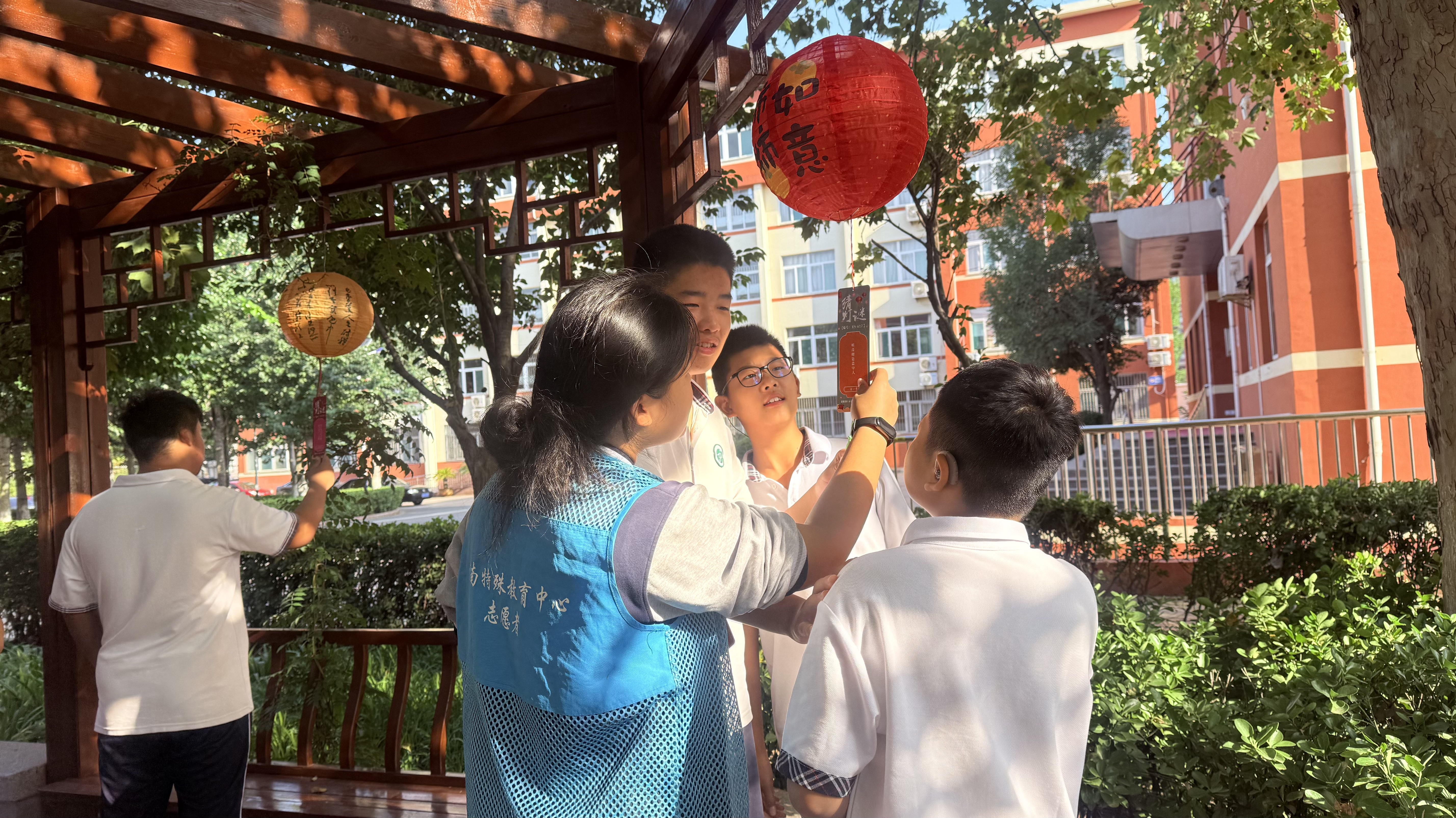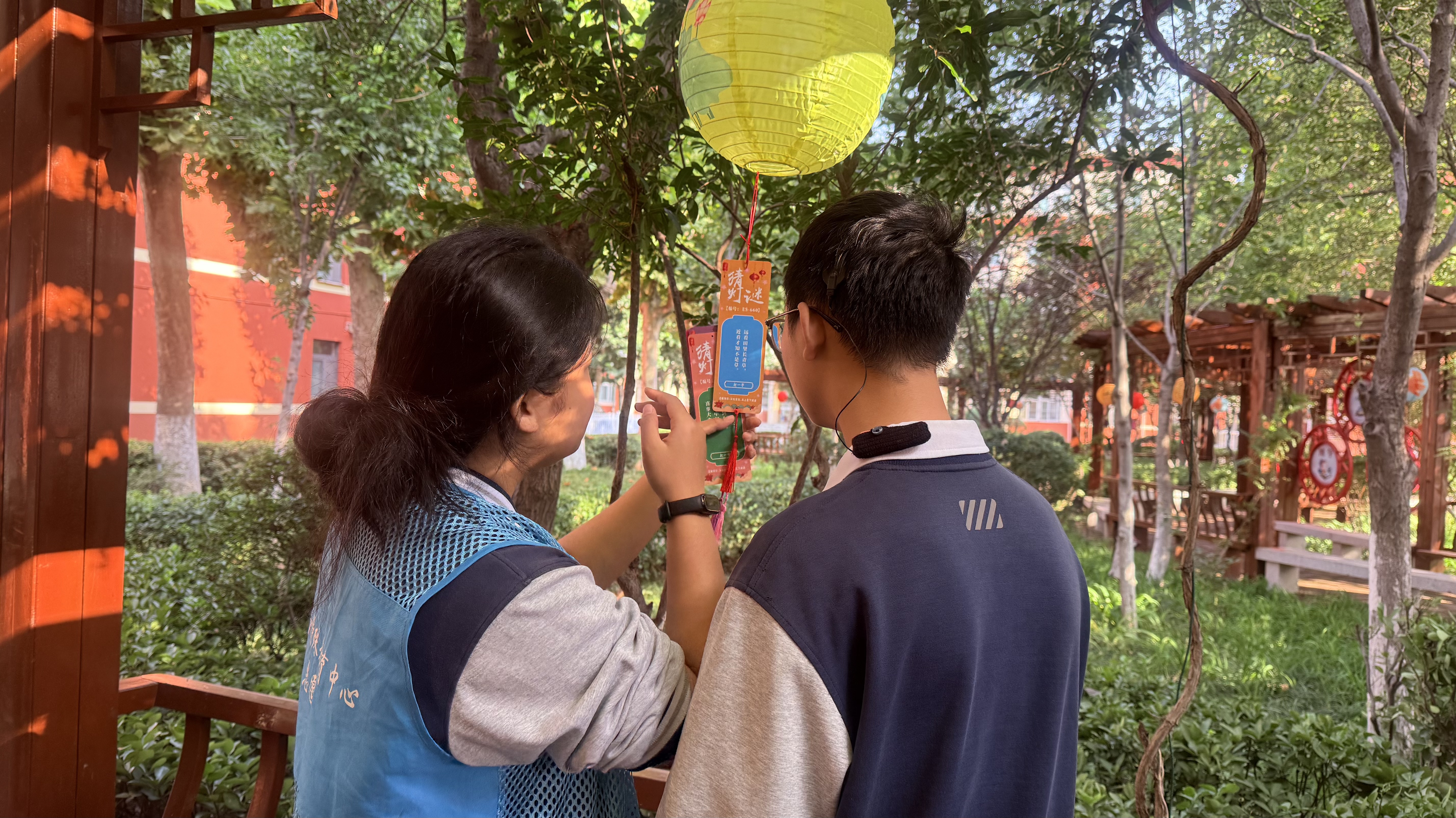为让这份心意顺利绽放,在后勤师傅的协助下,在老师与同学们的配合下,大家小心翼翼地将花灯逐一提挂,花灯悬于绿叶间,恰似繁星落枝。暮色初临,花灯点亮,暖黄光晕透过纸面,将长廊绘成一幅雅致的中秋图景。 同学们三三两两围在花灯下,目光追着灯下坠着的灯谜纸条,或蹙眉思索,或轻声交流。灯谜内容丰富有趣,从诗词名句到趣味字谜,从民俗知识到生活常识,包罗万象。每当有人猜中谜底,便引来一阵欢呼,清脆的笑声随光影摇曳,为校园注入灵动生机。