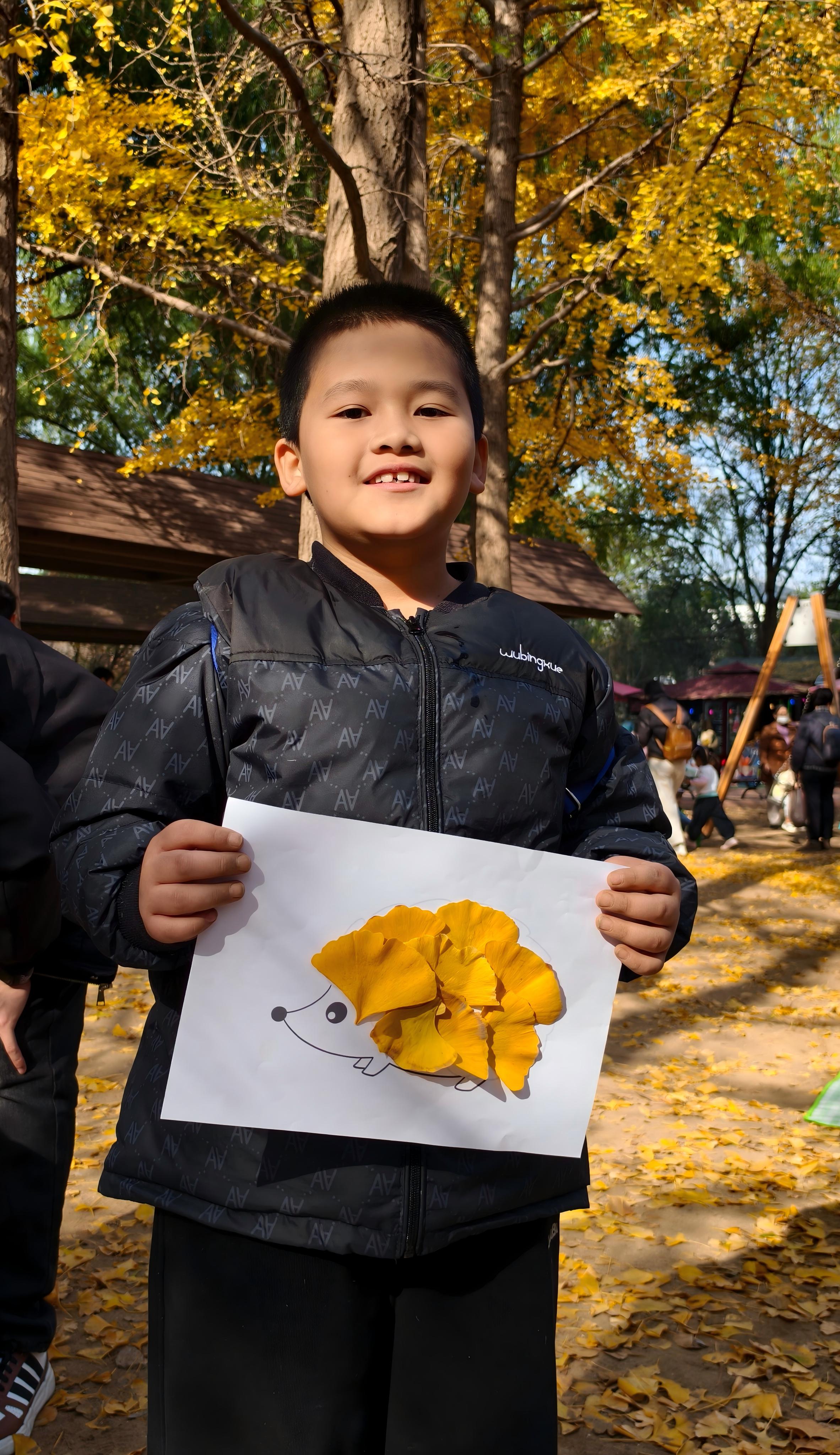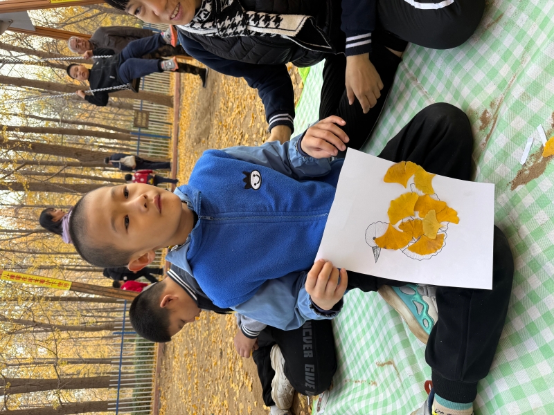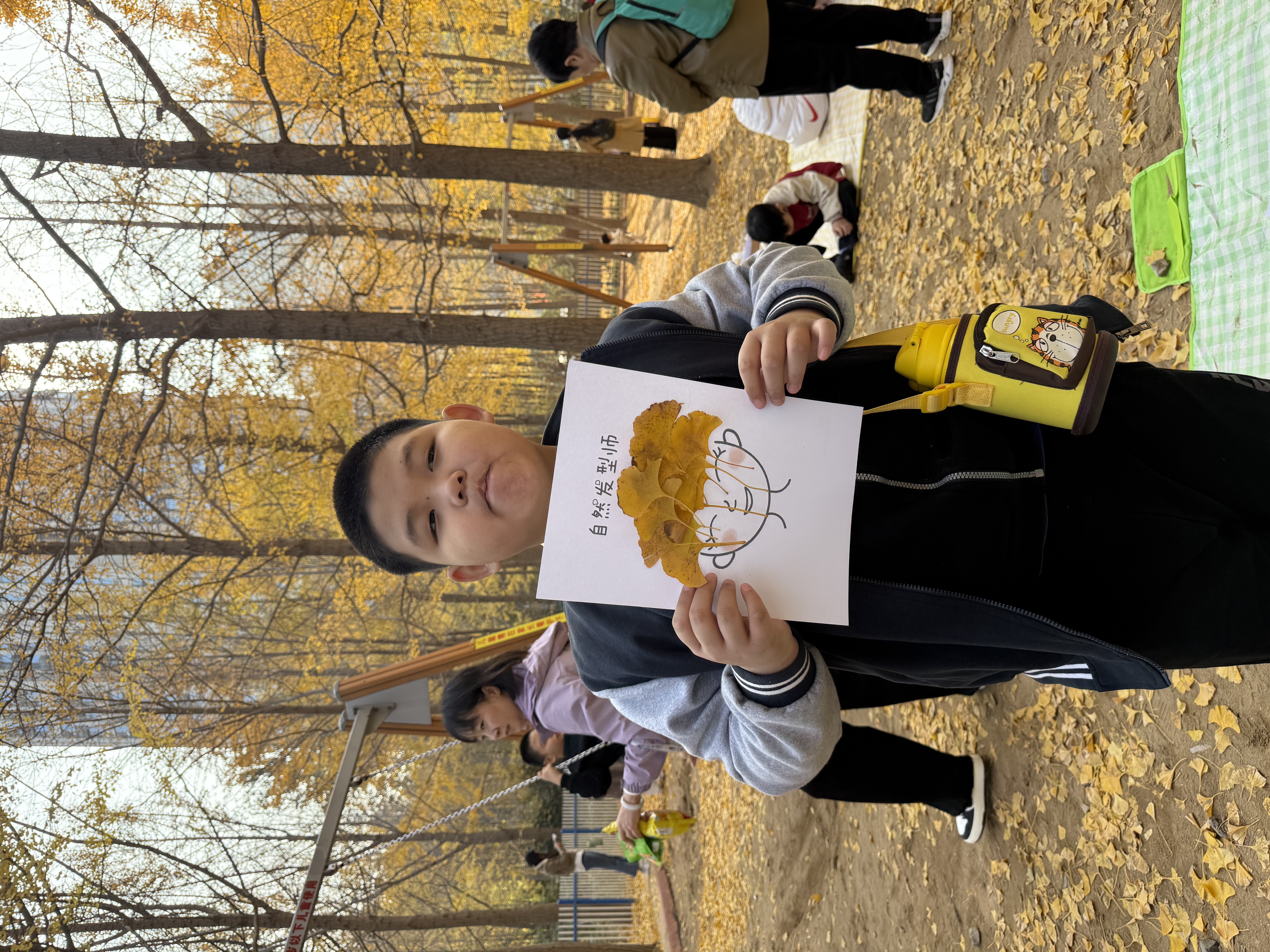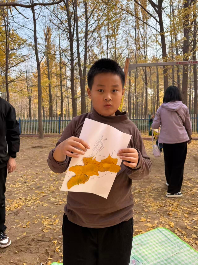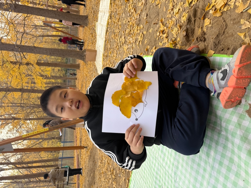 巧制作品,定格温暖时光 拾叶归来,大家围坐在一起,开启创意手工之旅。班主任提前准备好卡纸、胶水、彩笔等材料,耐心示范着树叶拼贴技巧。孩子们尽情发挥想象:有的用树叶搭配出简单的小动物造型,有的用树叶设计秋叶发型,还有的为纸裙染上秋色。在老师和家长的协助下,孩子们一步步尝试粘贴、调整,完成属于自己独一无二的作品。最后,大家开心地与作品合影,每一张照片都记录着专注、合作与成就感。