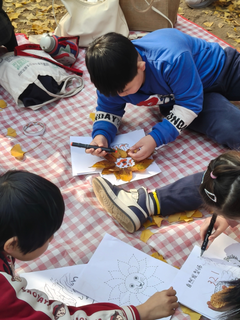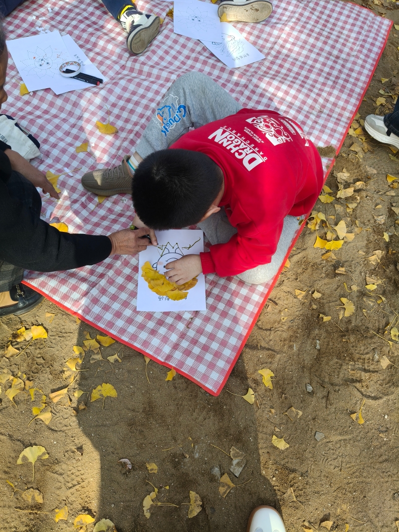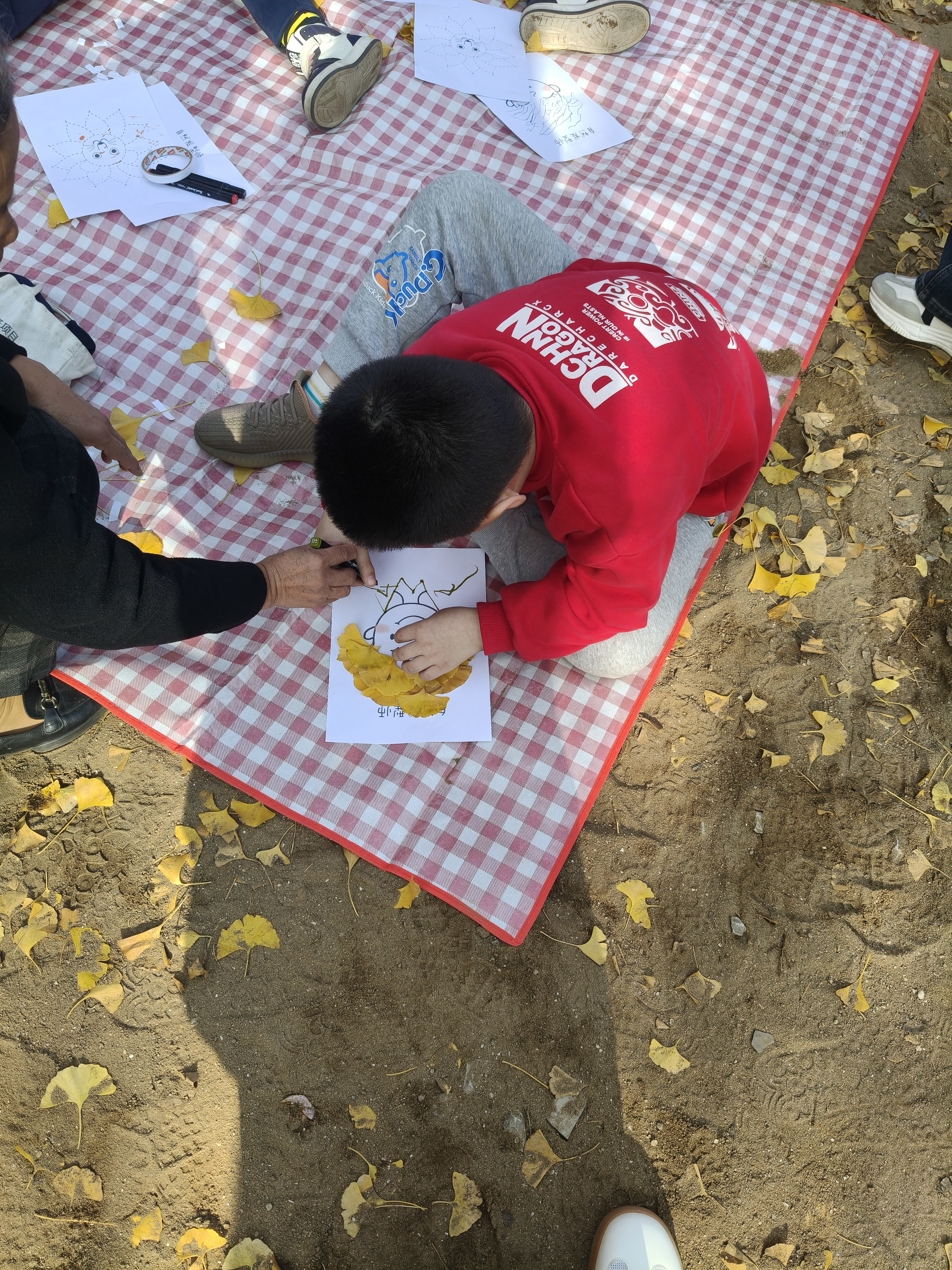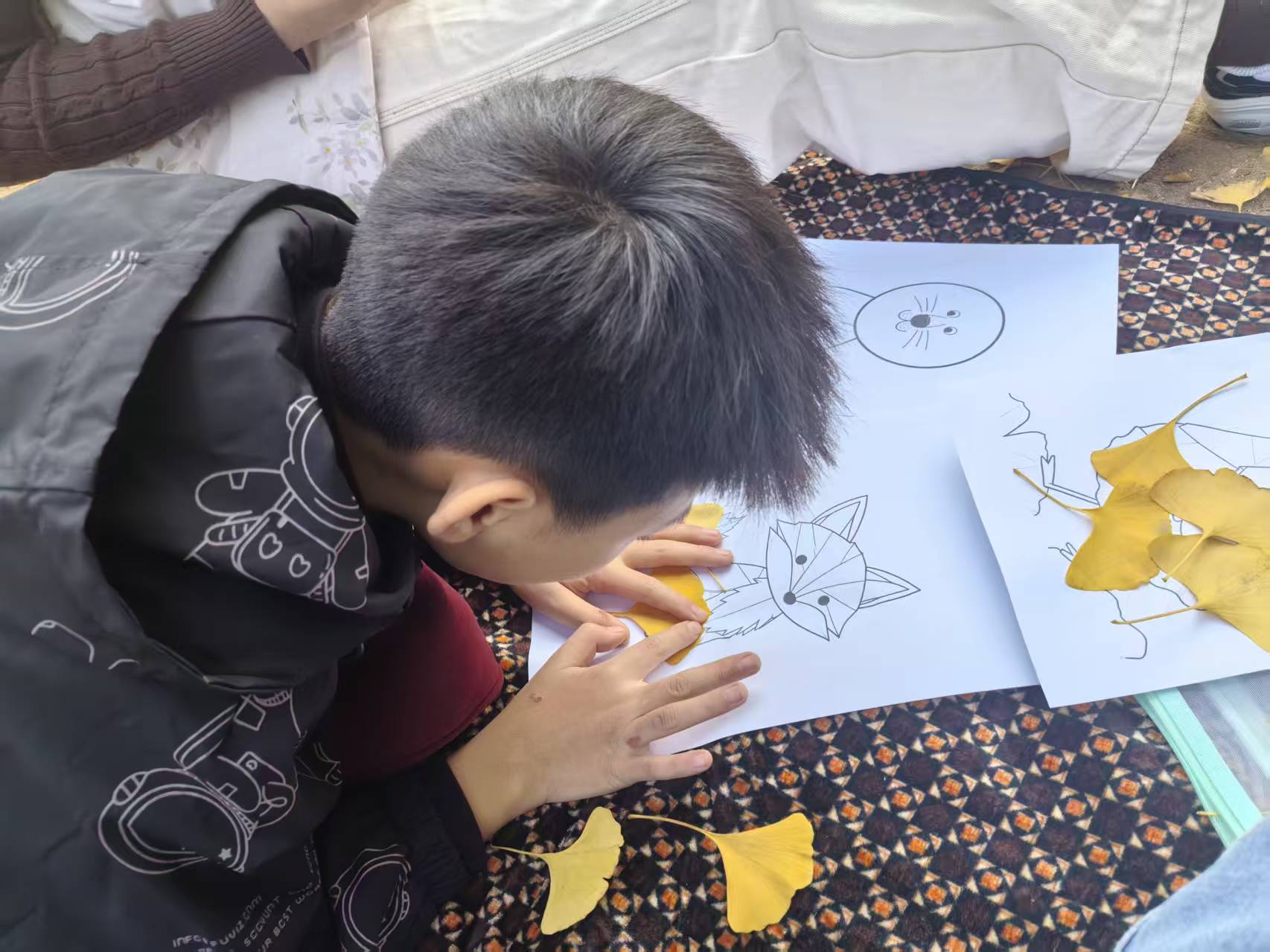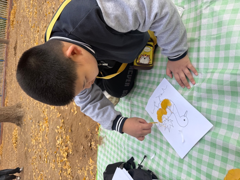 巧制作品,定格温暖时光 拾叶归来,大家围坐在一起,开启创意手工之旅。班主任提前准备好卡纸、胶水、彩笔等材料,耐心示范着树叶拼贴技巧。孩子们尽情发挥想象:有的用树叶搭配出简单的小动物造型,有的用树叶设计秋叶发型,还有的为纸裙染上秋色。在老师和家长的协助下,孩子们一步步尝试粘贴、调整,完成属于自己独一无二的作品。最后,大家开心地与作品合影,每一张照片都记录着专注、合作与成就感。