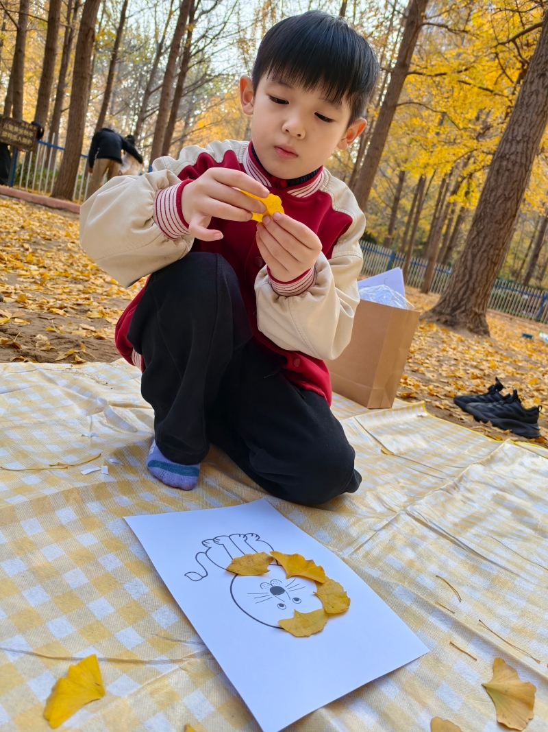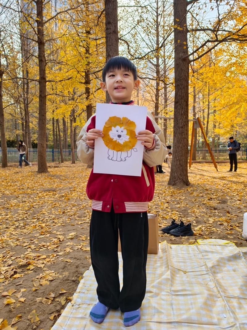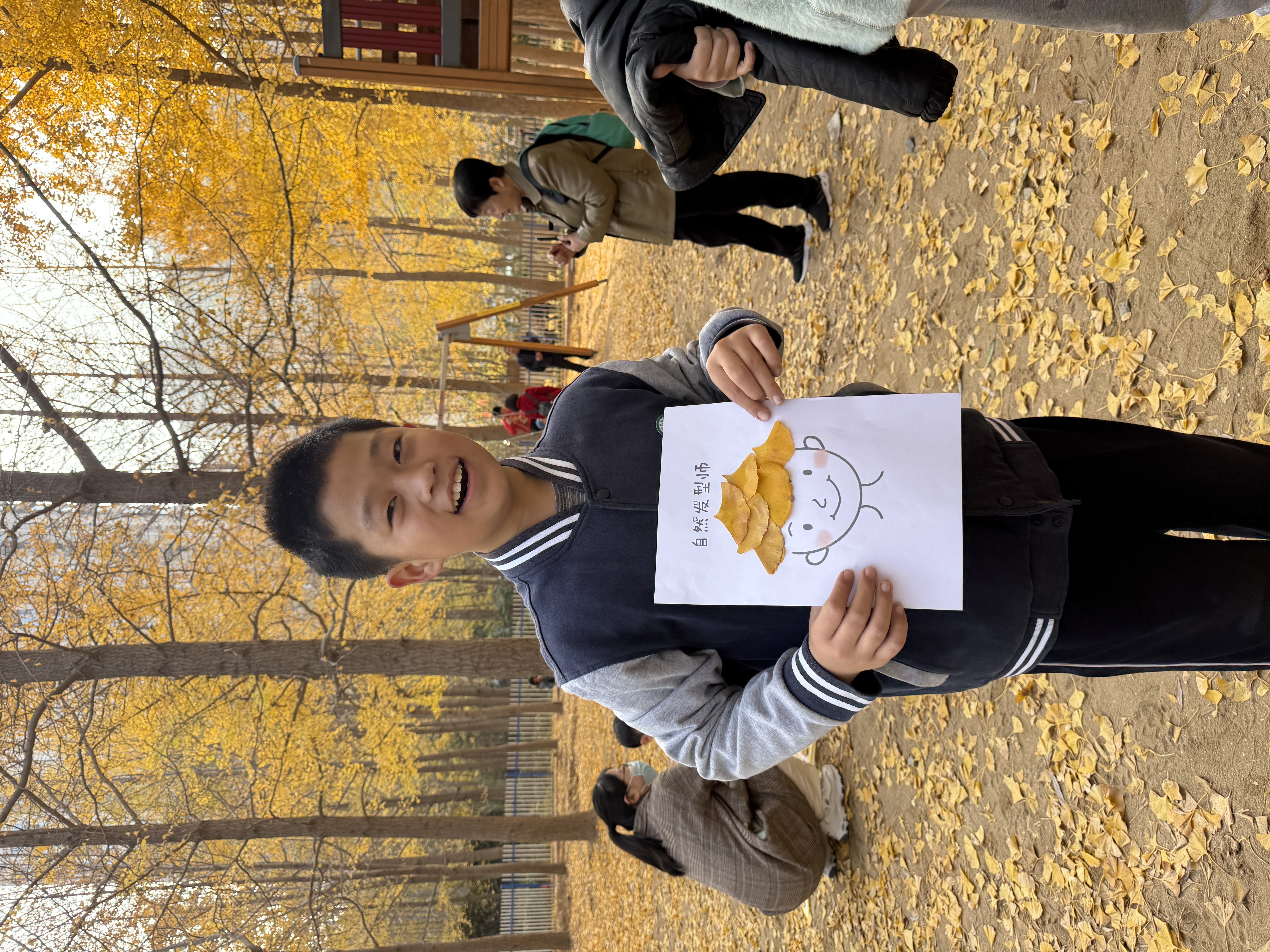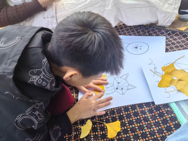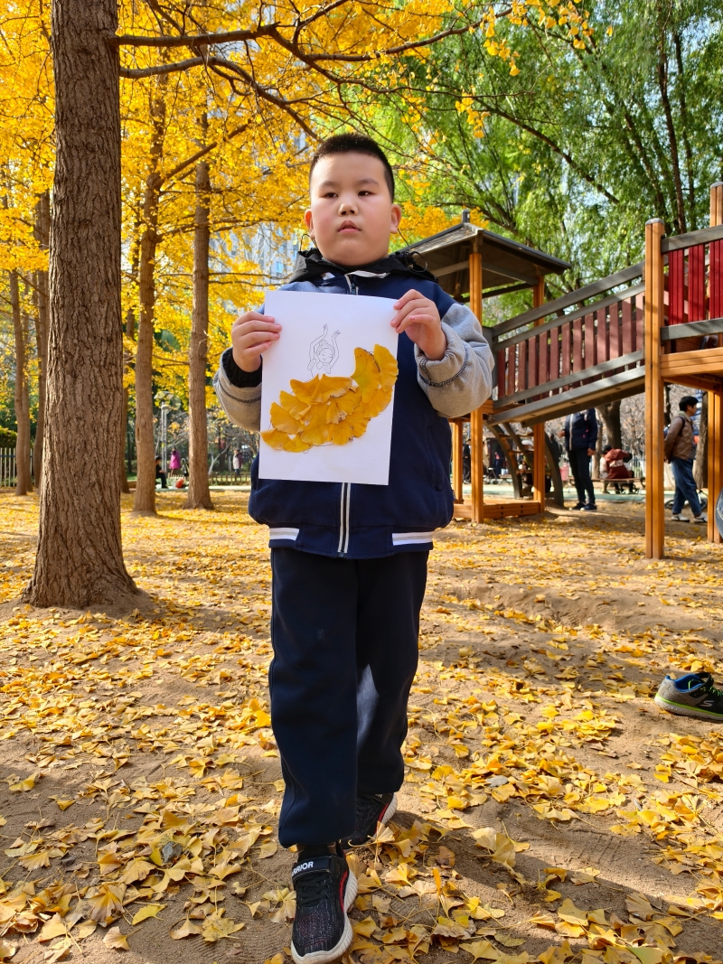 巧制作品,定格温暖时光 拾叶归来,大家围坐在一起,开启创意手工之旅。班主任提前准备好卡纸、胶水、彩笔等材料,耐心示范着树叶拼贴技巧。孩子们尽情发挥想象:有的用树叶搭配出简单的小动物造型,有的用树叶设计秋叶发型,还有的为纸裙染上秋色。在老师和家长的协助下,孩子们一步步尝试粘贴、调整,完成属于自己独一无二的作品。最后,大家开心地与作品合影,每一张照片都记录着专注、合作与成就感。