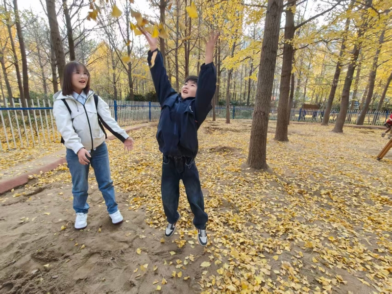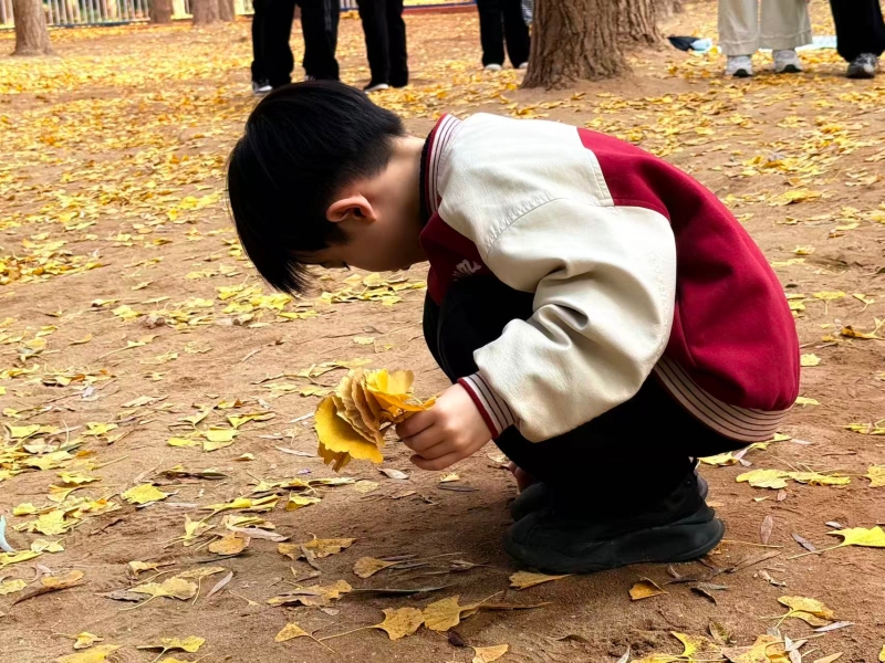 林间拾叶,与秋意撞个满怀 清晨,济南公交集团中部分公司七队的专车驶入校园,载着满怀期待的师生与家长,一路欢声笑语,奔赴大自然。 步入银杏林,金黄的叶片如星光洒落,孩子们在老师和家长的陪伴下,慢慢走进这片金色天地。有的学生指尖轻轻触碰落在地上的银杏叶,感受叶片的光滑与纹理;有的则专注地挑选形状完整、颜色鲜亮的叶子,把喜欢的叶片小心翼翼地放进掌心;还有的学生在老师引导下,尝试将落叶一片片叠起,脸上露出专注又满足的神情。家长们耐心陪伴在孩子身边,或帮忙捡拾,或轻声鼓励,老师则穿梭在林间,及时回应孩子们的疑问,用温柔的话语引导他们观察树叶的不同形态,林间洋溢着暖心的互动与探索的喜悦。