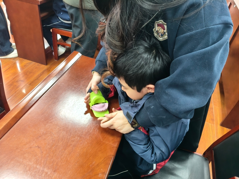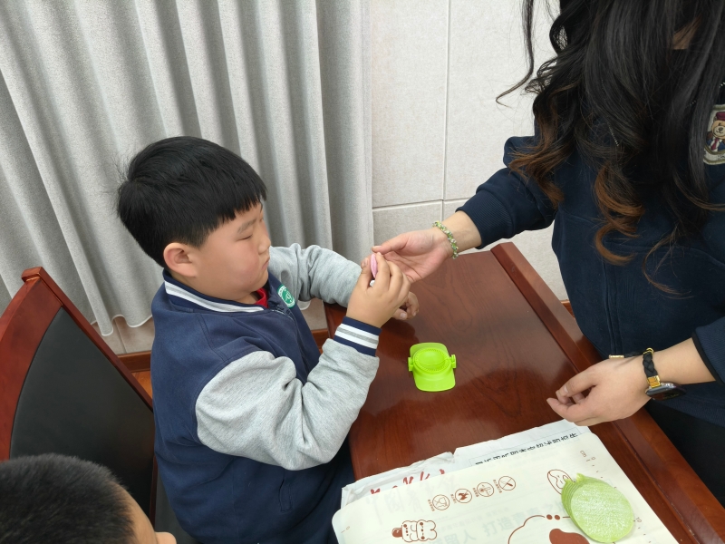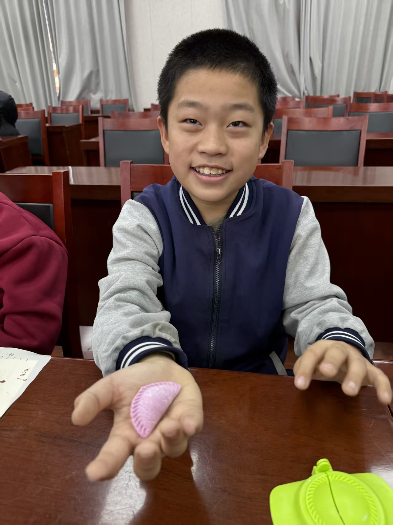 活动在充满期待的氛围中正式开启。教室里,食堂备好的面团、馅料与工具早已摆放整齐,空气中飘散着阵阵食材清香。班主任率先演示,从放馅、对折到捏合,一步步讲解包饺子的手法。对于动作协调稍弱的学生,老师便俯身靠近,手把手耐心引导。考虑到孩子们的认知与动手特点,活动还贴心地准备了造型可爱的饺子模具——铺皮、放馅、轻压,一个个规整小巧的饺子便在孩子们手中诞生。 孩子们神情专注,有的仔细模仿老师的手法,有的兴奋地用模具创造着自己的作品。遇到困难时,他们会抬头望向老师或身边的同伴,在轻声鼓励与协助中,一次次尝试、一点点进步。当亲手包好的饺子被整齐放在托盘里,孩子们纷纷举起自己的“作品”,眼中闪动着成就感,镜头定格下这充满暖意的瞬间。