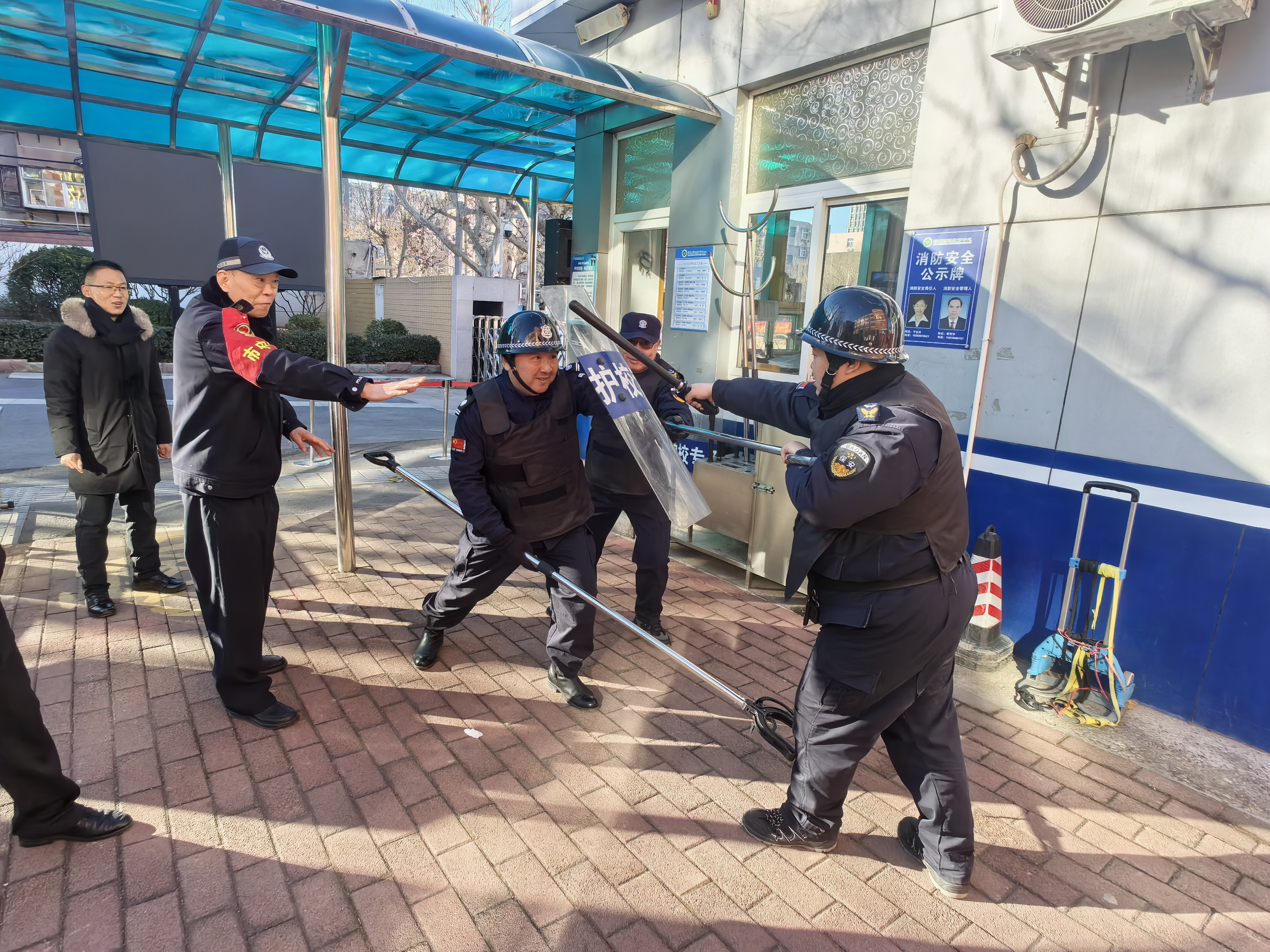 在反恐防暴应急处置环节,模拟“可疑人员”试图闯入校园,安保人员迅速启动最小应急单元,使用防暴器械进行拦截,并启动一键报警。在现场指导的郭勇警官对处置流程进行全程观察与评估,校方安保力量按预案迅速控制事态,有效保障师生安全。