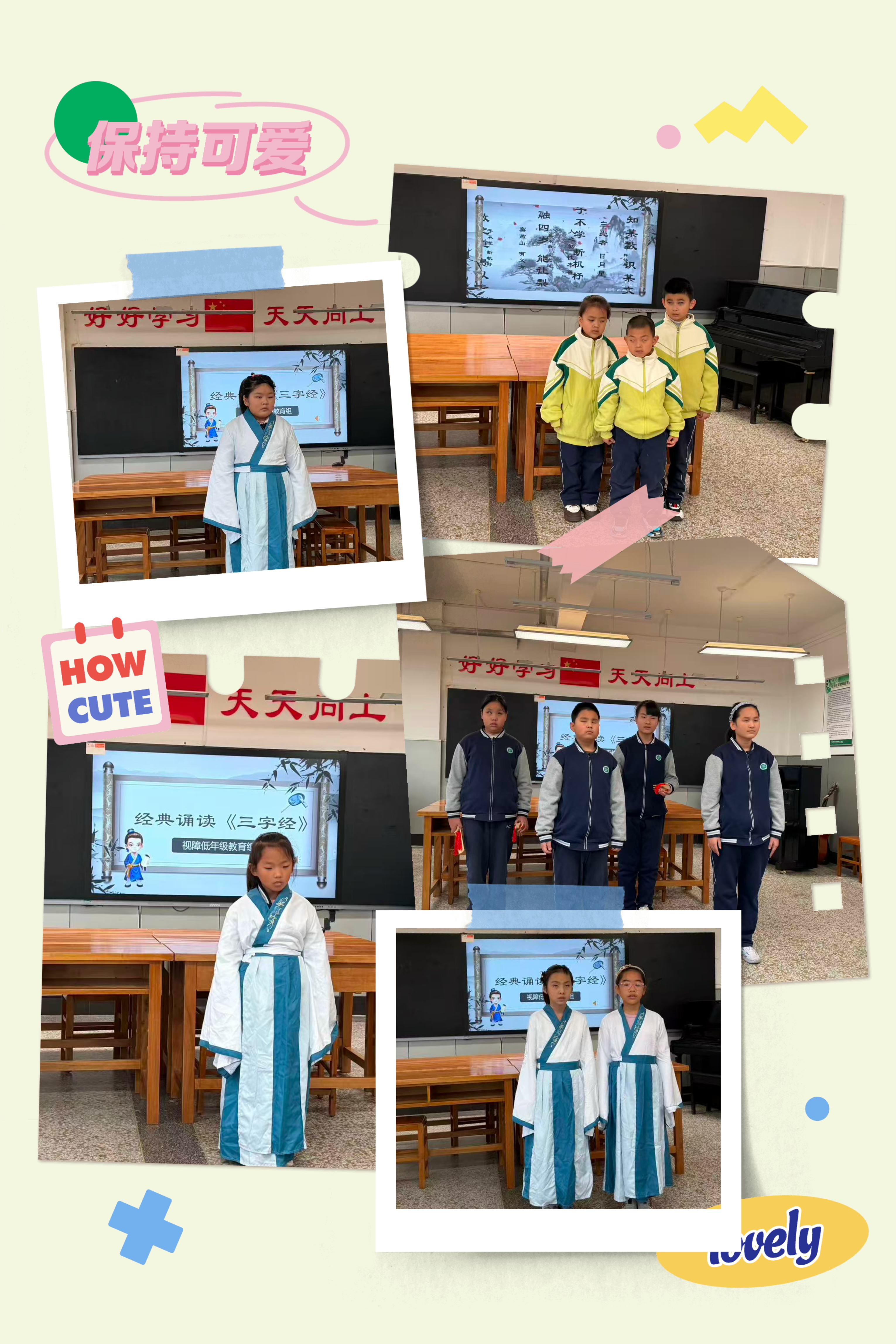 12月23日上午大课间,活动正式在音乐教室拉开帷幕。视障低年级教育组组长刘颖慧作为主持人亲切开场,随后,展演环节正式开启,各班按顺序依次登台,身着汉服的同学们用独特的方式演绎经典,全盲学生清晰有力的诵读与低视生整齐的节奏呼应,赢得阵阵掌声,稚嫩的诵读声中满是对经典的致敬,每名同学的脸上都洋溢着自信从容的笑容,展现出视障学子积极向上的精神风貌。