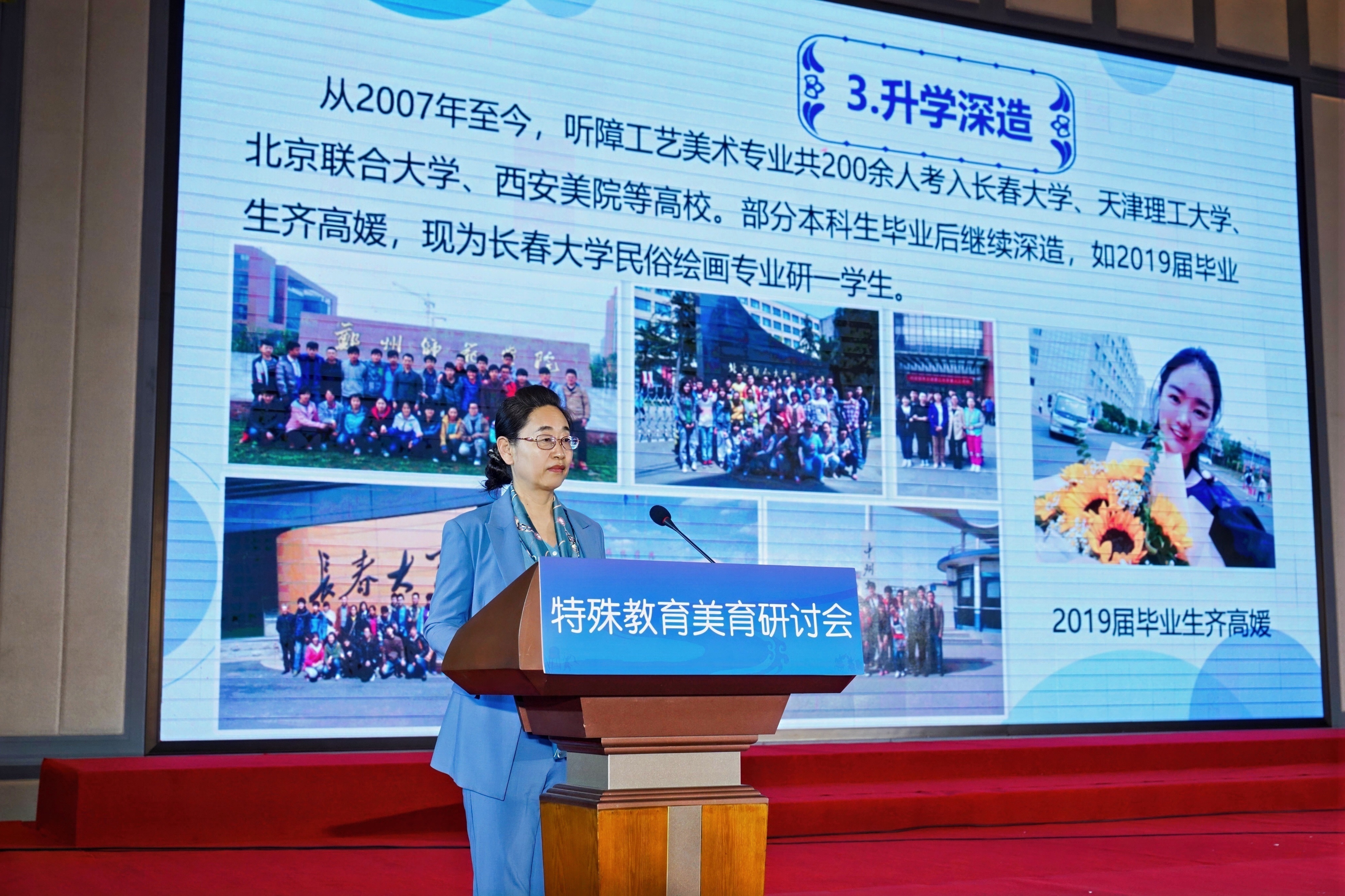 汇报中,于校长还分享了学校精心打造的以“启智润心 绽放潜能”为育人目标的美育课程体系,指出在课程实施过程中,学校通过分层课程设计,精准对接不同学习水平和需求的学生;采用双师协同教学模式,充分发挥不同教师的专业优势;融入地域文化元素,让学生在熟悉的文化氛围中感受艺术魅力。这些实施路径成功将美育课程转化为鲜活的教育实践,有效激发了听障学生的艺术潜能,显著提升了他们的艺术素养与人文情怀,形成了从“潜能激发”到“潜能绽放”的特殊教育实践范式。
