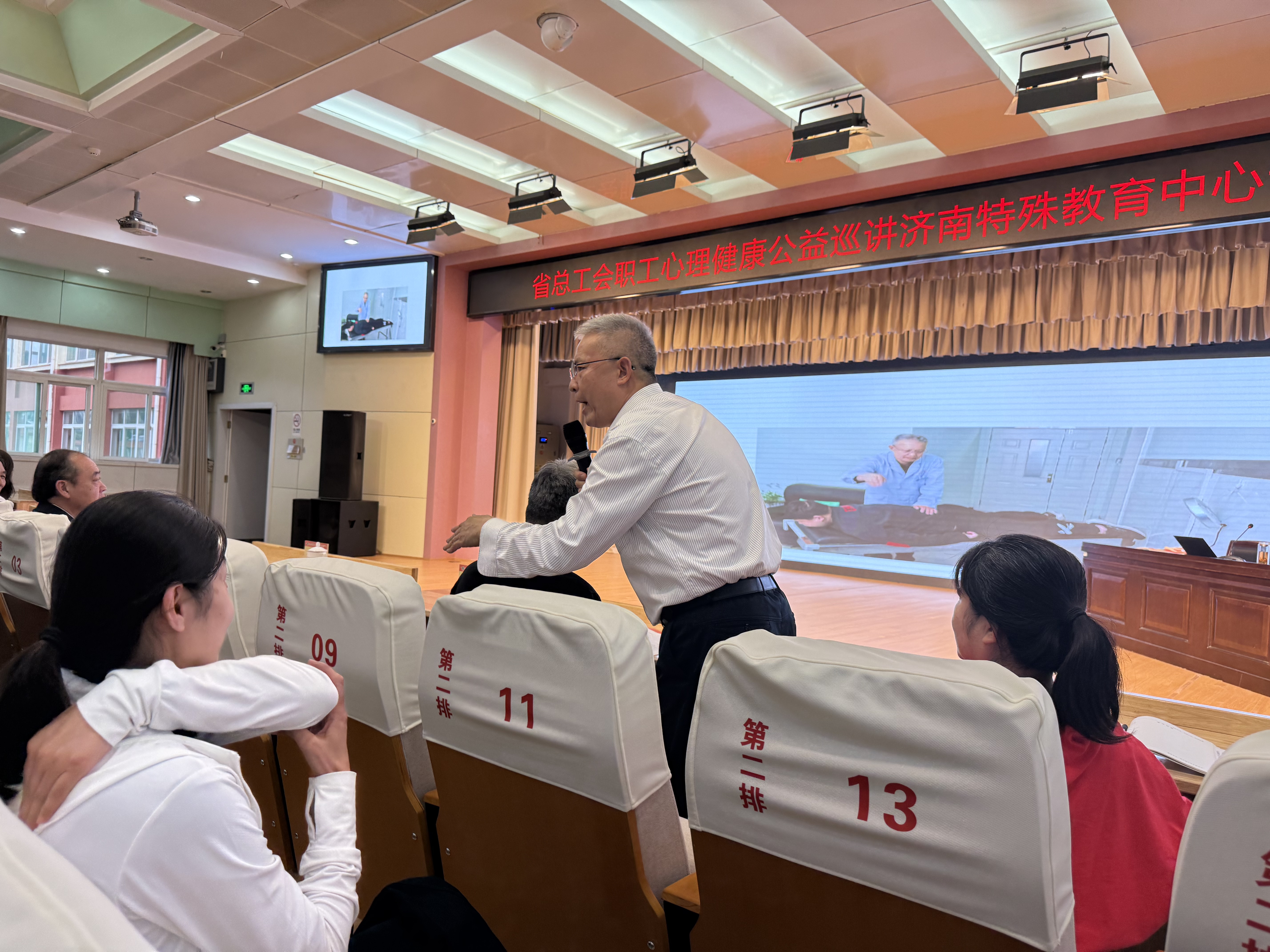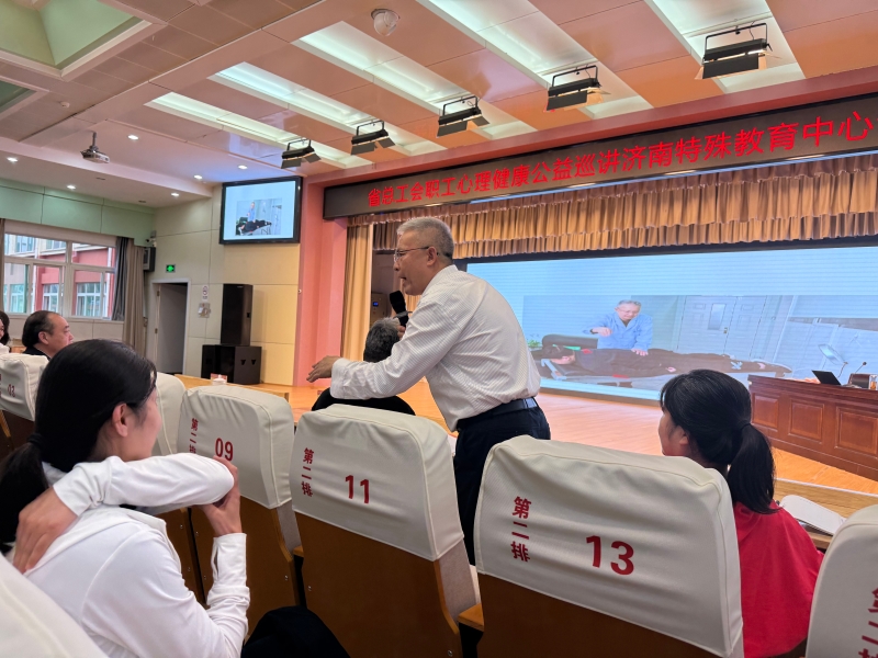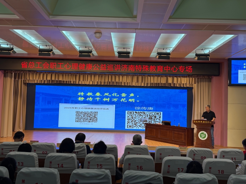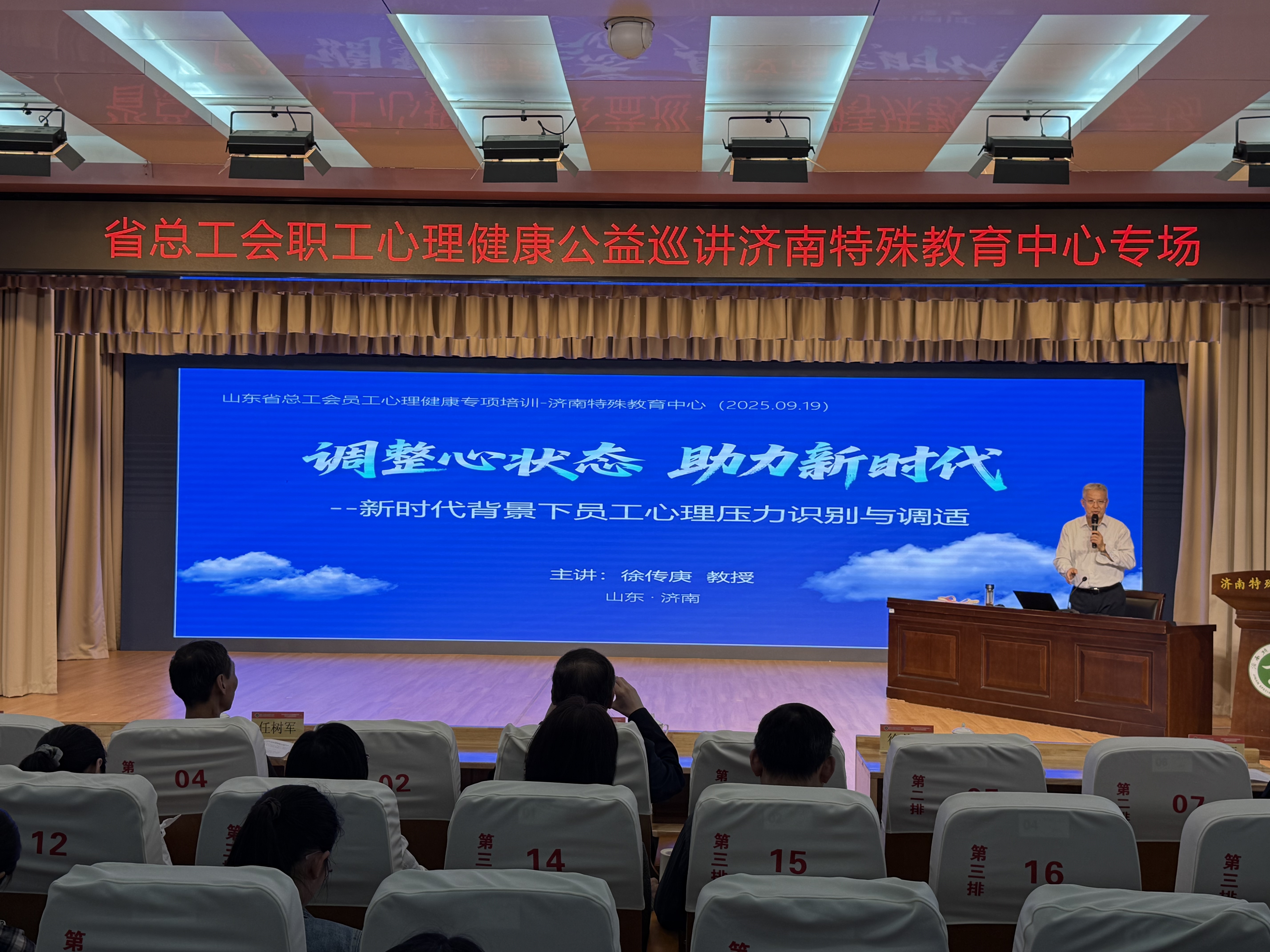 为深入贯彻落实习近平总书记关于工人阶级和工会工作的重要论述,关注教职工心理健康,提升情绪管理与心理调适能力,传递工会组织对一线教育工作者的深切关怀,2025年9月19日下午,由山东省总工会主办的职工心理健康公益巡讲活动走进济南特殊教育中心,举办专场心理讲座。山东中医药高等专科学校教授、心理咨询专家徐传庚应邀作题为《调整“心”状态,助力新时代——新时代背景下员工心理压力调适》的专题讲座。