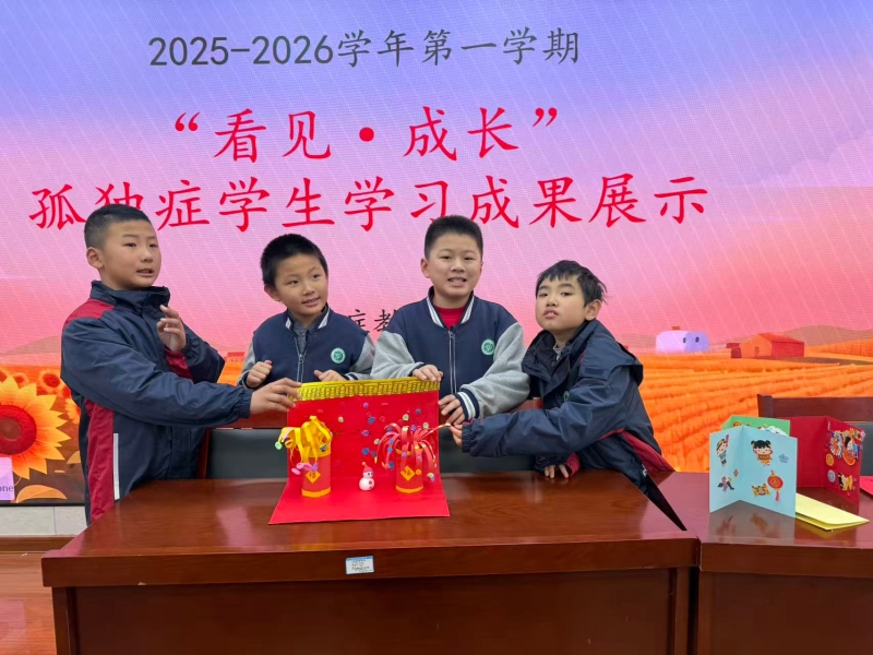 每一颗星星都有独特的轨迹,每一个生命都有绽放的权利。为集中展现孤独症学生文化学习、艺术创作方面的阶段性成果,传递对孤独症群体的理解、接纳与关怀,1月8日上午,济南特殊教育中心孤独症教研组在多媒体教室开展“看见·成长”孤独症学生学习成果展示活动。孤独症教研组全体师生齐聚一堂,用自信与热爱书写成长篇章,校长于生丹、副校长黎青华、教务处主任王玉玲全程见证孤独症学生的成果与进步。 活动以多元展示为核心,分为学业技能展示、美工技能展示、评奖颁奖三大环节。
