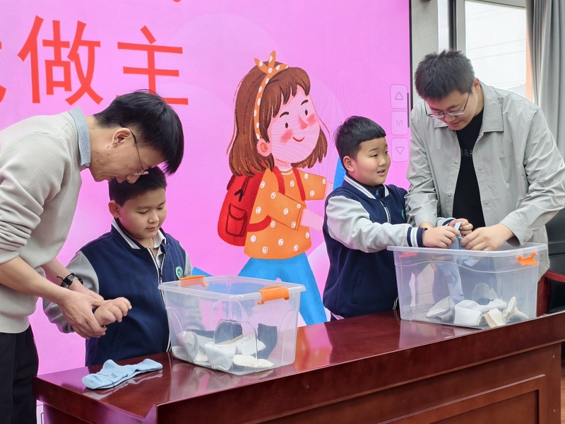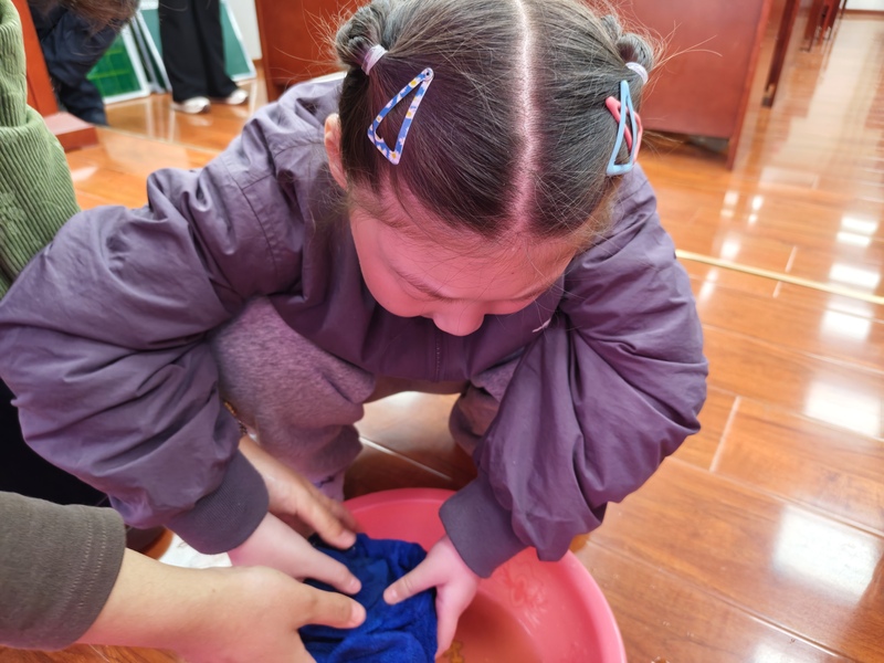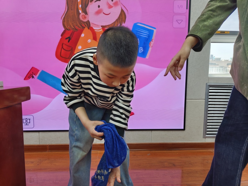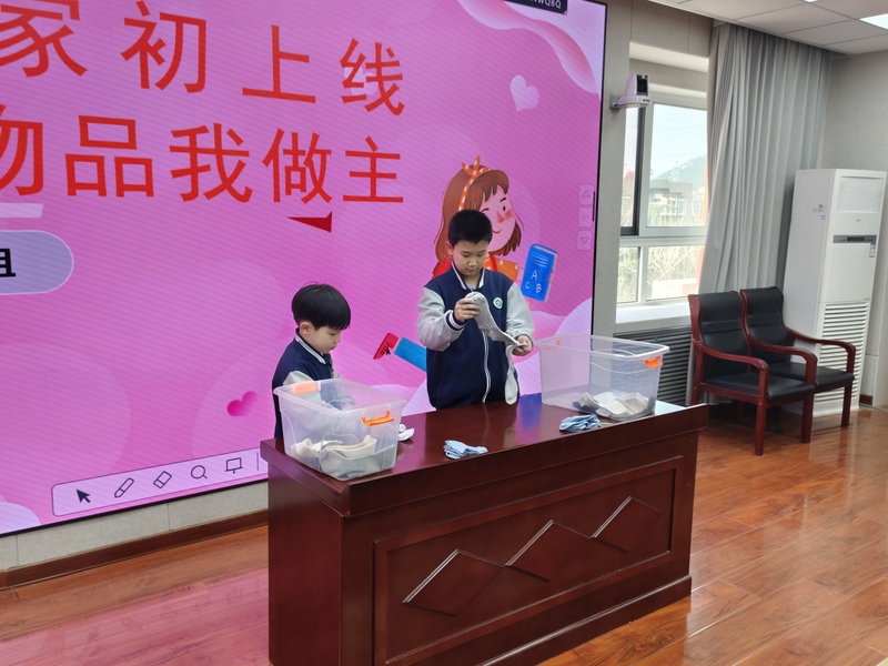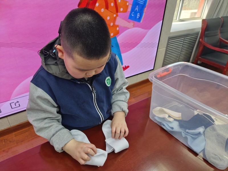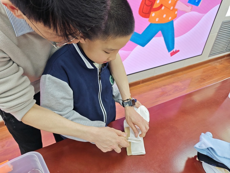 一年级:颜色配对叠袜子 一年级的孩子们从整理小件衣物起步,开启趣味劳动之旅。在老师的耐心引导下,孩子们专注分辨袜子的色彩、款式,慢慢将同款同色的袜子细心配对,再一步步折叠整齐、摆放归位。看似简单的小动作,不仅锻炼了孩子们的手部精细动作和颜色辨识能力,更培养了初步的收纳意识,帮助孩子养成规整物品的好习惯。