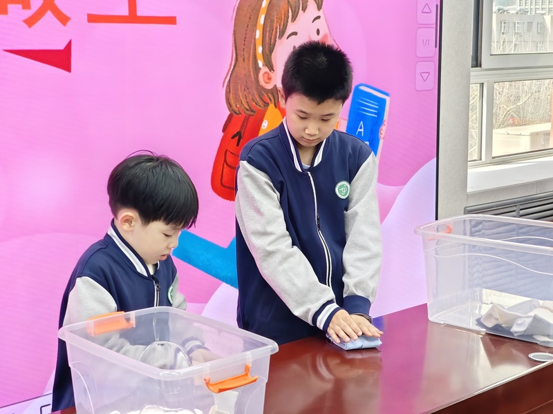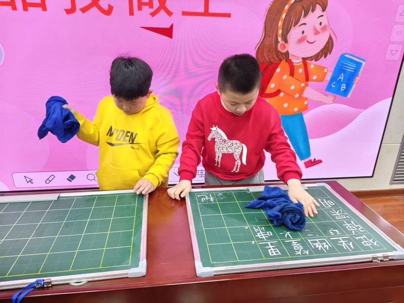 二年级:洗抹布、擦黑板 二年级的同学们化身小小清洁员,学着打理身边的环境卫生。孩子们跟着老师认真清洗抹布、拧干水分,一点点擦拭黑板,清理粉笔残留,劳作完毕后再将抹布洗净、放回原位。在这项贴近日常的劳动中,孩子们慢慢提升基础的清洁动手能力,感受集体环境的整洁美好,逐步树立责任意识,学会爱护身边环境。