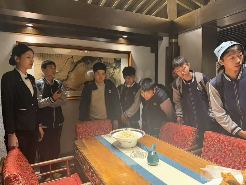 在中国鲁菜博物馆,同学们在专业讲解员引导下有序参观鲁菜文化展区、食材器具展厅、烹饪技艺展示区等,沉浸式体悟鲁菜作为八大菜系之首的深厚底蕴,直观感受鲁菜独特风格,参观过程中,同学们目不转睛眼神中满是对烹饪技艺的好奇与向往。本次实践紧扣“文化浸润+职业体验”融合教育理念,鲁菜博物馆工作人员特意安排同学们品尝鲤鱼跃龙门、滑炒里脊丝两道经典鲁菜,大家细细品味食材搭配与烹饪火候的精妙,将课堂理论与实地文化体验深度结合,进一步加深对中餐烹饪专业的热爱,坚定学好技能、以匠心逐梦的信念。