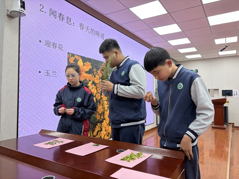 “感知清明”环节介绍清明节的时令特点与节气由来,让学生在听觉中读懂清明“万物生长、缅怀追思”的双重内涵。学生上台闻荠菜、榆钱等带春天气息的植物,大家在触觉与嗅觉的双重体验中,感受春日生机,理解清明时节“生”与“思”的深刻关联。