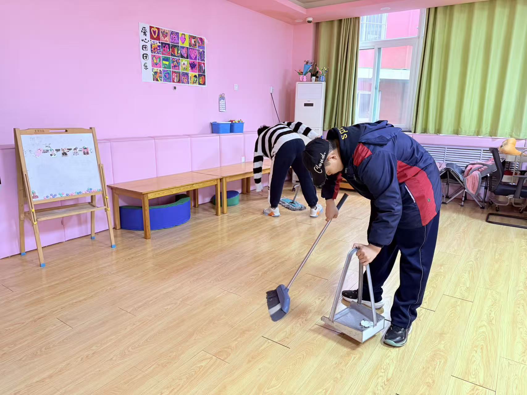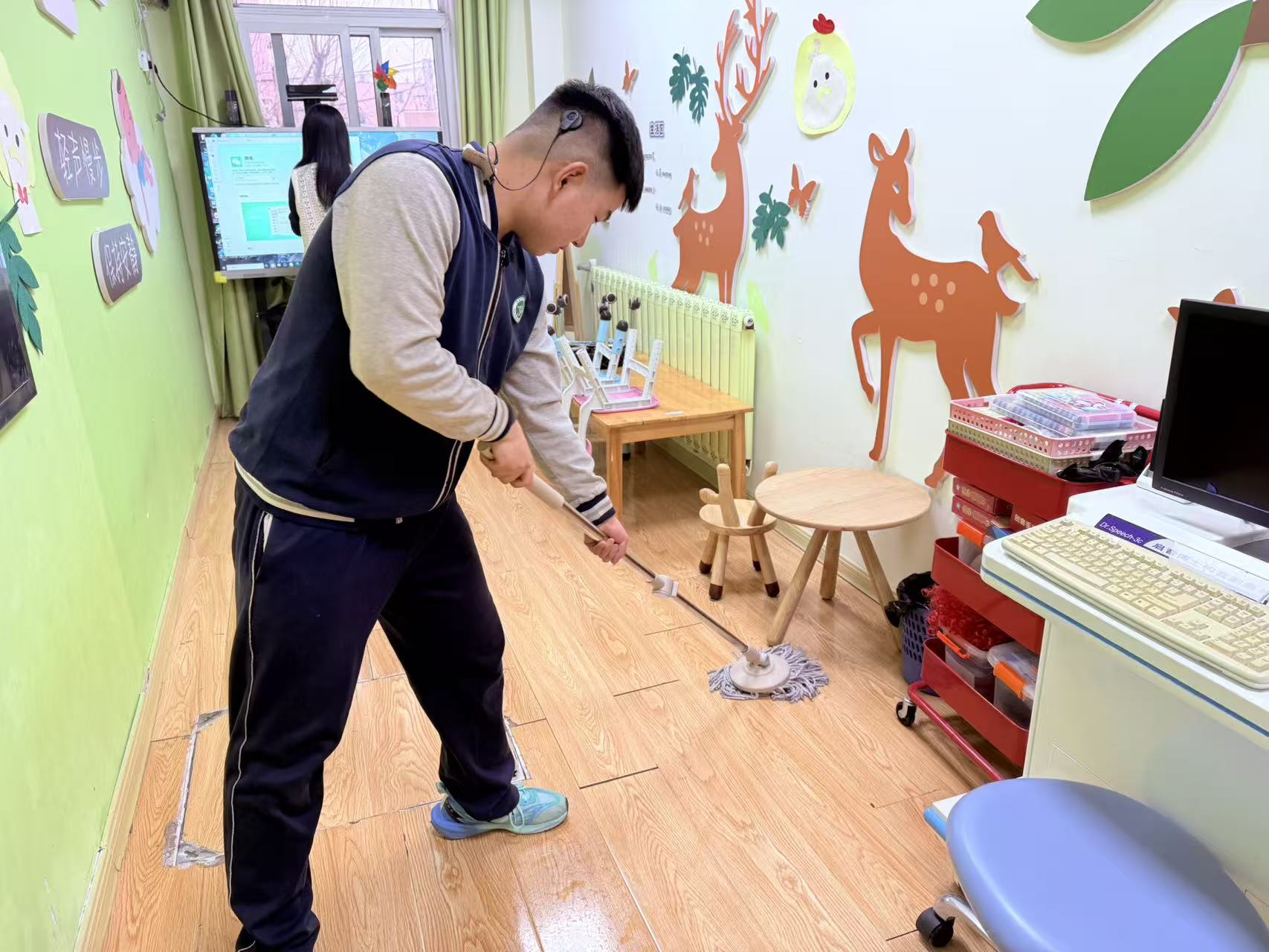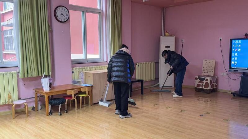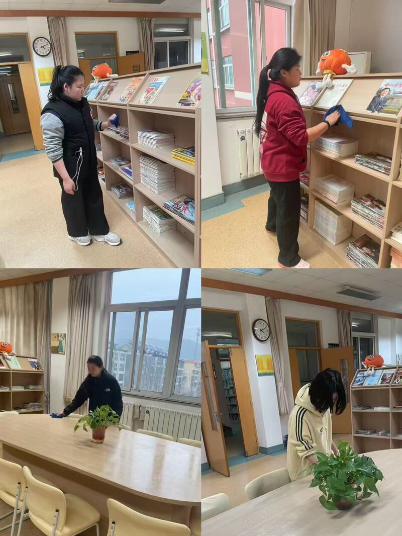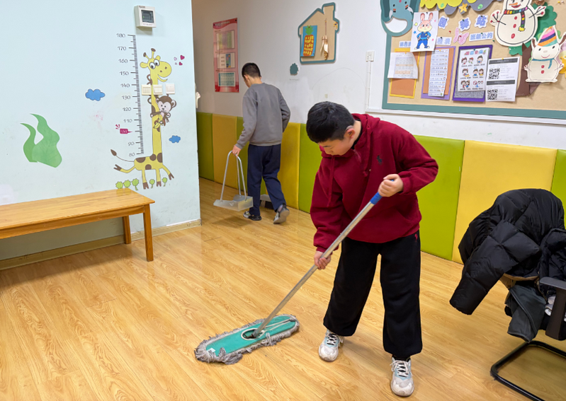 另一边,前往资源中心的同学们也干劲满满。他们拿着抹布、扫帚、拖把等清洁工具,对教室、走廊、活动区域进行全面清扫。同学们不怕脏、不怕累,把每一个角落都打扫得干干净净。看着焕然一新的环境,同学们的脸上露出了开心的笑容,用无声的表达传递着付出后的喜悦与满足。