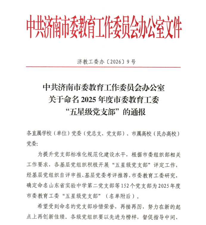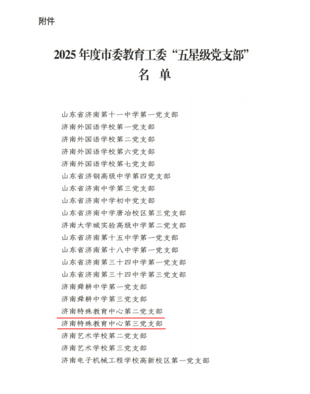近日,中共济南市委教育工委发布《关于命名2025年度市委教育工委“五星级党支部”的通报》,共评定152个党支部被评为2025年度“五星级 党支部”,其中,济南特殊教育中心第二党支部、第三党支部榜上有名! 在学校“守望特教 慈心育人”党建品牌引领下,第二党支部、第三党支部以“一个党员就是一面旗帜、一个支部就是一座堡垒”为行动指南,立足专业领域打造支部特色,将党建工作与教育教学等业务工作深度融合,成为推动学校高质量发展的坚强战斗堡垒。 第二党支部扎实推进“五基双化”“五力双全”建设,在特教课题研究、康复教育、资源中心建设等工作中成效突出,助力济南获批国家特教改革实验区,第二党支部书记工作室获评市级“双带头人”工作室。第三党支部严格落实“三会一课”、主题党日等制度,打造“特教微光”志愿服务品牌,积极开展融合教育与社区志愿服务,党员教师在省市教学竞赛、学生技能大赛中屡获佳绩。 获评“五星级党支部”不是终点,而是特教人更高标准服务特殊学生的起点。济南特殊教育中心将持续擦亮“守望特教 慈心育人”党建品牌,让党旗在特殊教育教育教学一线高高飘扬,用看得见的“红色引擎”托起每一个特殊孩子的成长梦想。