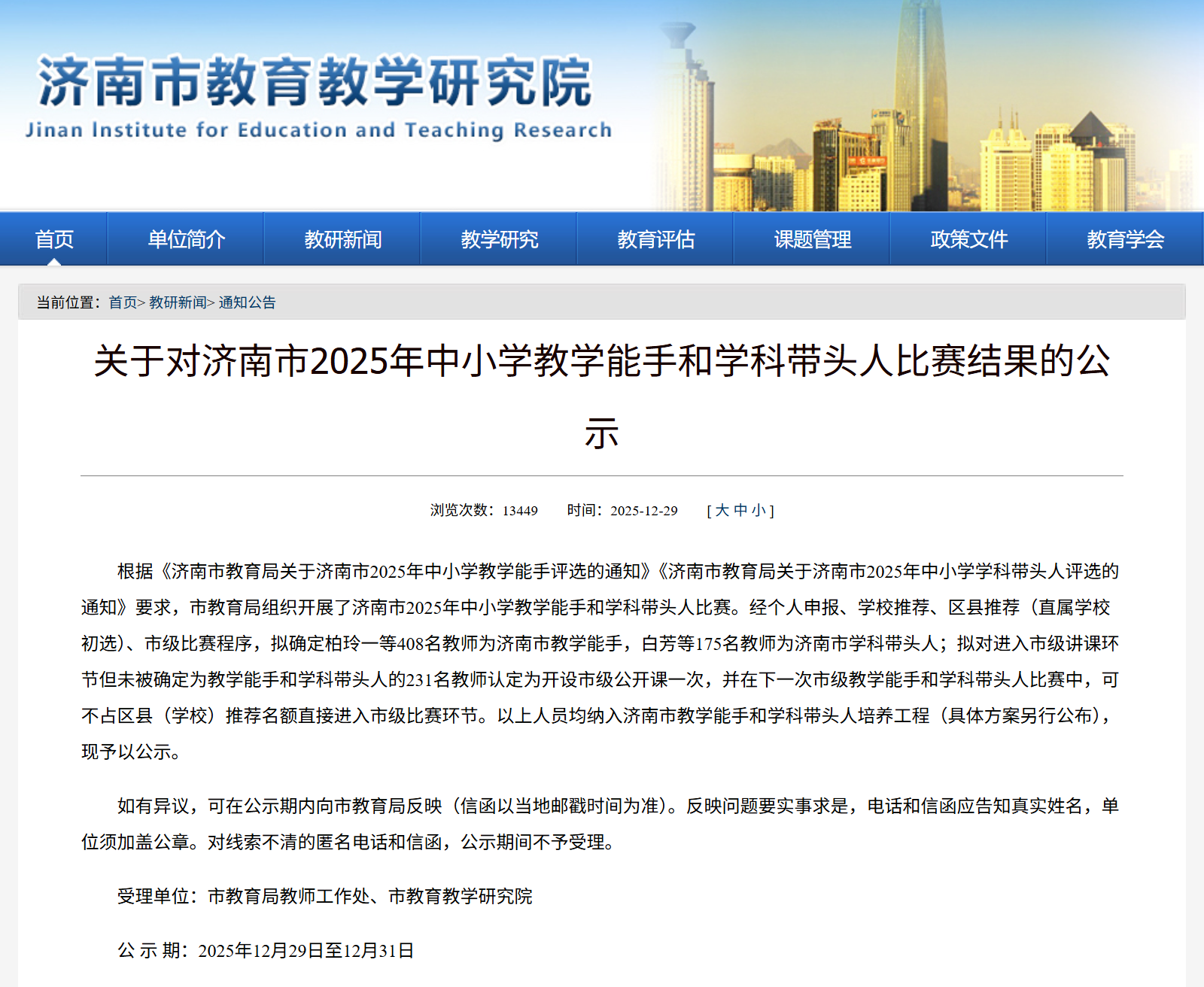 近日,济南市2025年中小学教学能手和学科带头人比赛结果在济南市教育教学研究院进行公示,济南特殊教育中心刘晓娜、王玉玲两位老师获评学科带头人,庞荣荣老师获评教学能手。