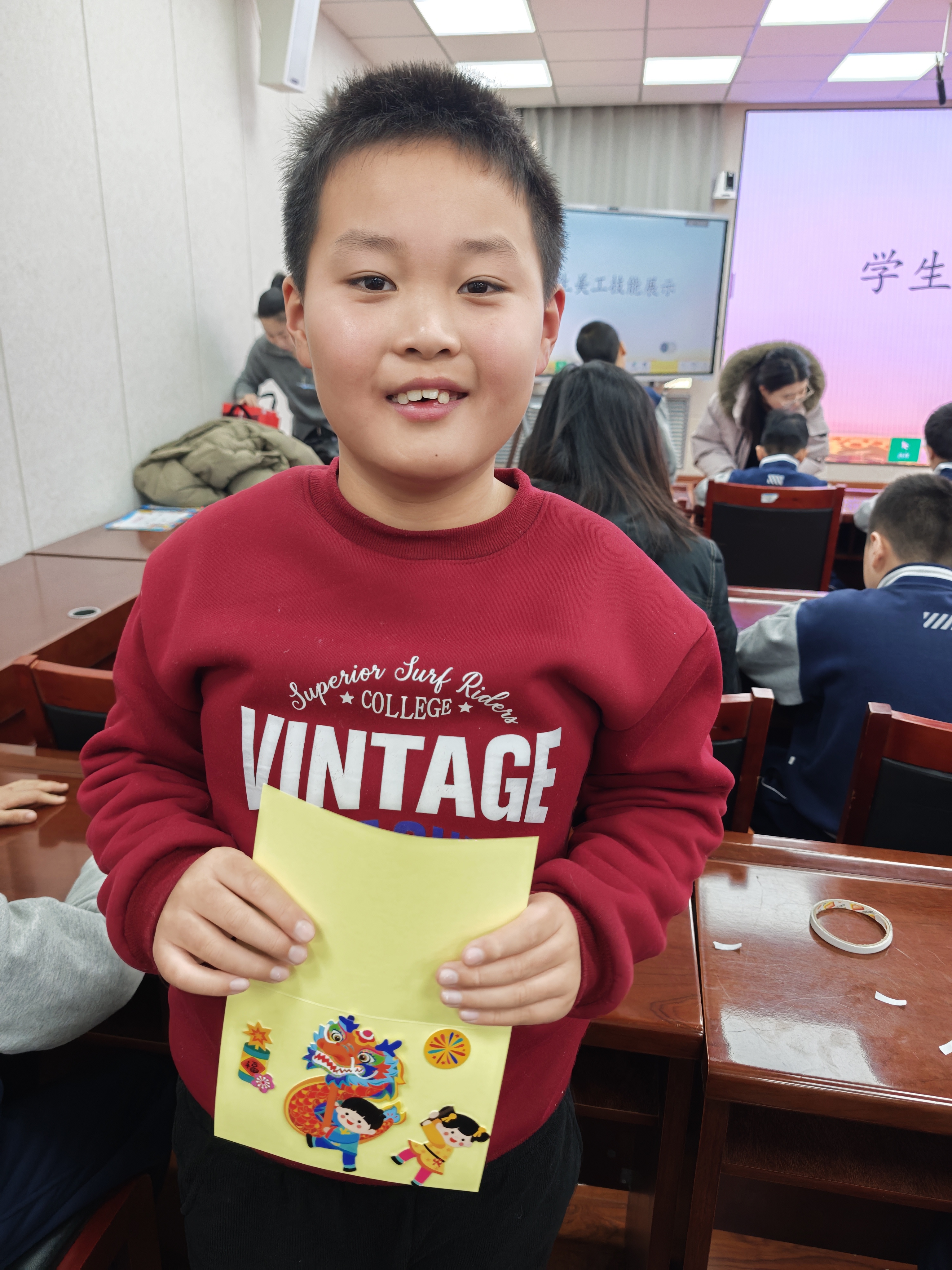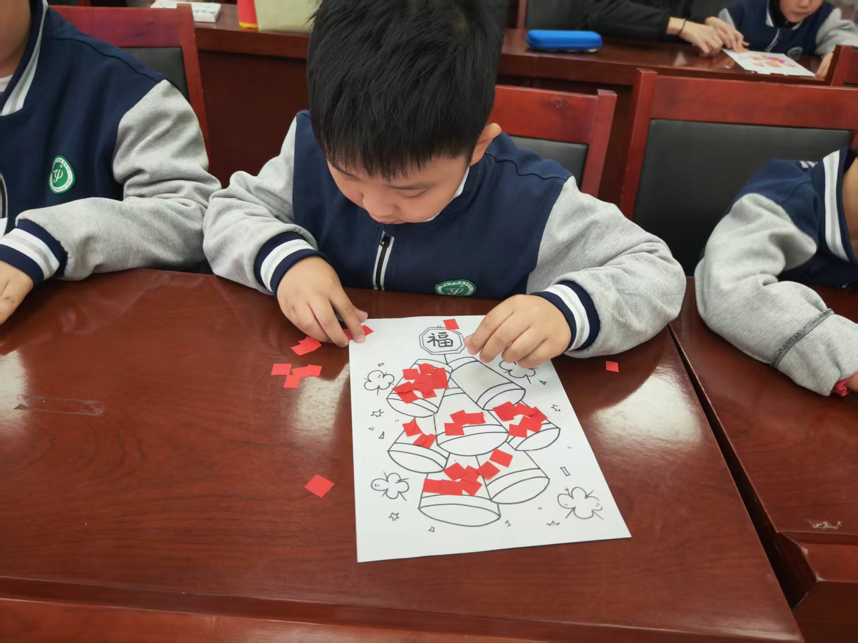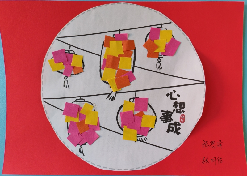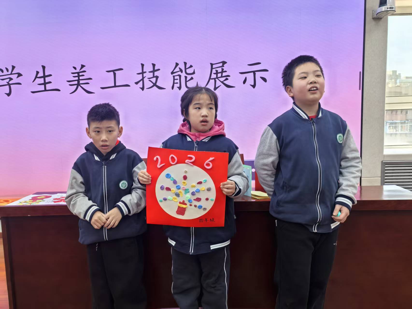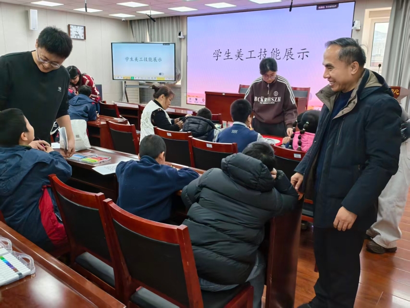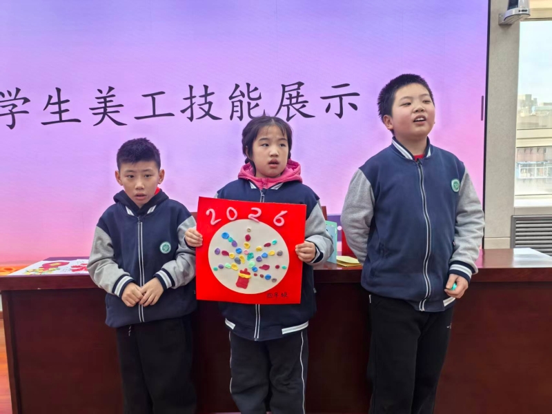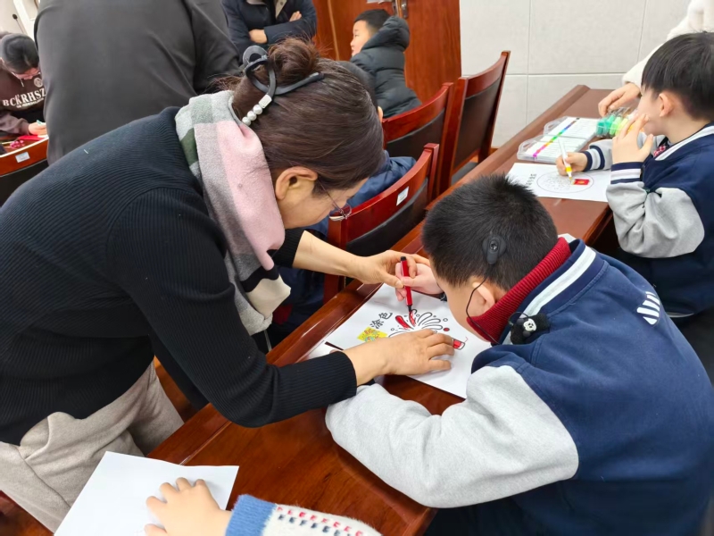 美工技能展示环节氛围热烈,全体学生以班级为单位,现场创作迎新年主题作品。填色画、粘贴画、黏土画等手工作品形式丰富多样,同学们或独立创作,或协作完成,指尖流转着创意与专注。一年级一班的刘源灏独立构思,三年级的王宇扬精心雕琢,四年级的合作小组默契配合,每一件作品都承载着孩子们的想象力与生命力。到场领导和老师轻声走到学生身边,静静欣赏创作过程,走入他们独特的思维世界,共同感受孩子们用双手编织出的美好愿景。
