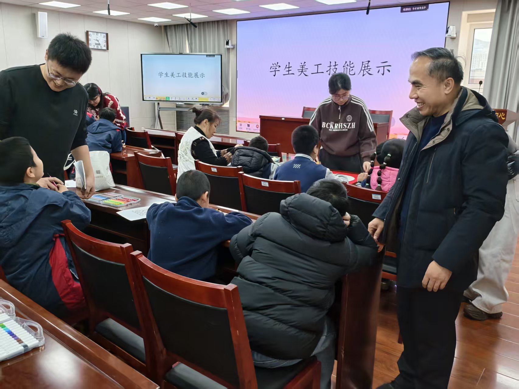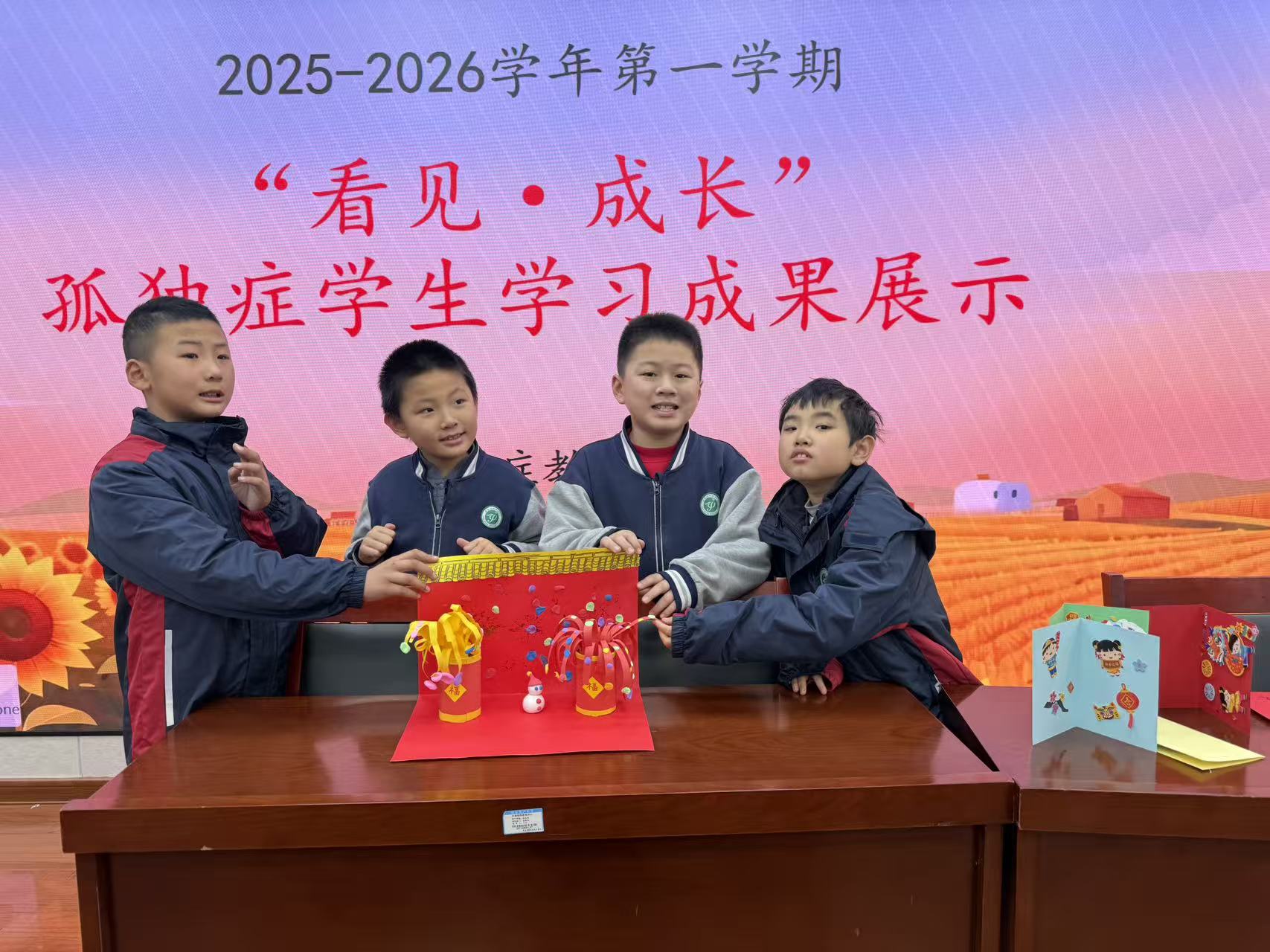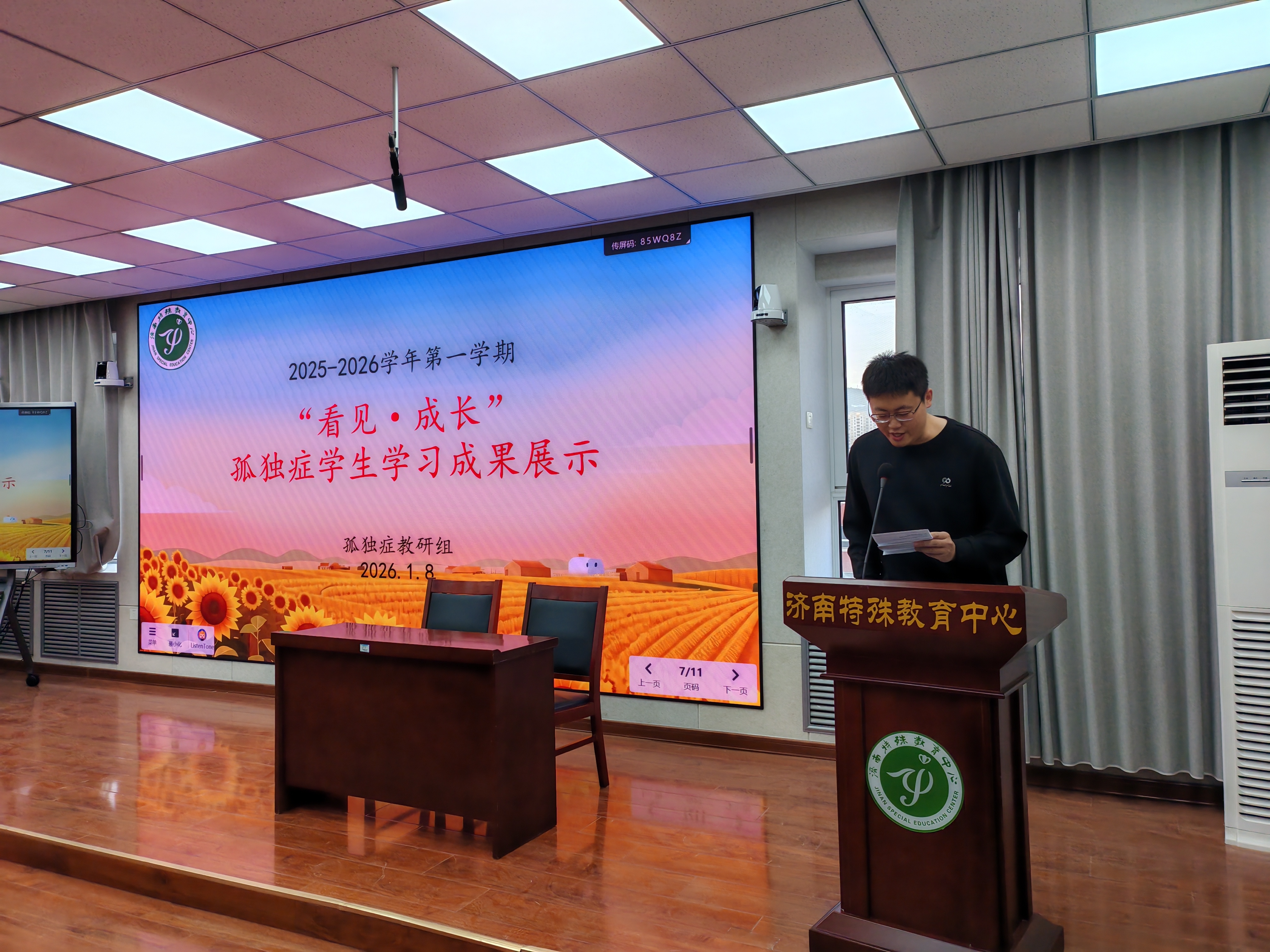 每一颗星星都有独特的轨迹,每一个生命都有绽放的权利。为集中展现孤独症学生文化学习、艺术创作方面的阶段性成果,传递对孤独症群体的理解、接纳与关怀,1月8日上午,济南特殊教育中心孤独症教研组在多媒体教室开展“看见·成长”孤独症学生学习成果展示活动。孤独症教研组全体师生齐聚一堂,用自信与热爱书写成长篇章,校长于生丹、副校长黎青华、教务处主任王玉玲全程见证孤独症学生的成果与进步。 活动以多元展示为核心,分为学业技能展示、美工技能展示、评奖颁奖三大环节。