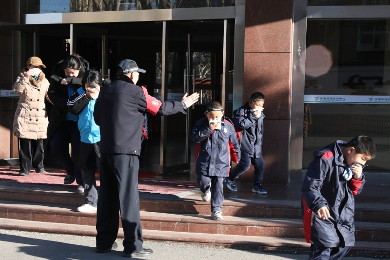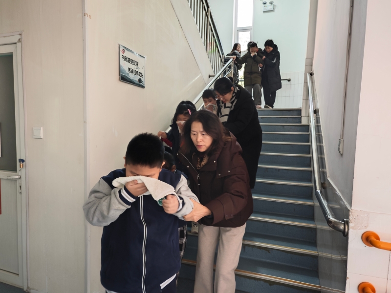 在消防疏散救援环节,模拟教学楼发生火情,教职工按照1分钟到位、3分钟疏散要求,依据特殊学生个体情况,辅助护送学生有序撤离至安全区域,确保不落一人。