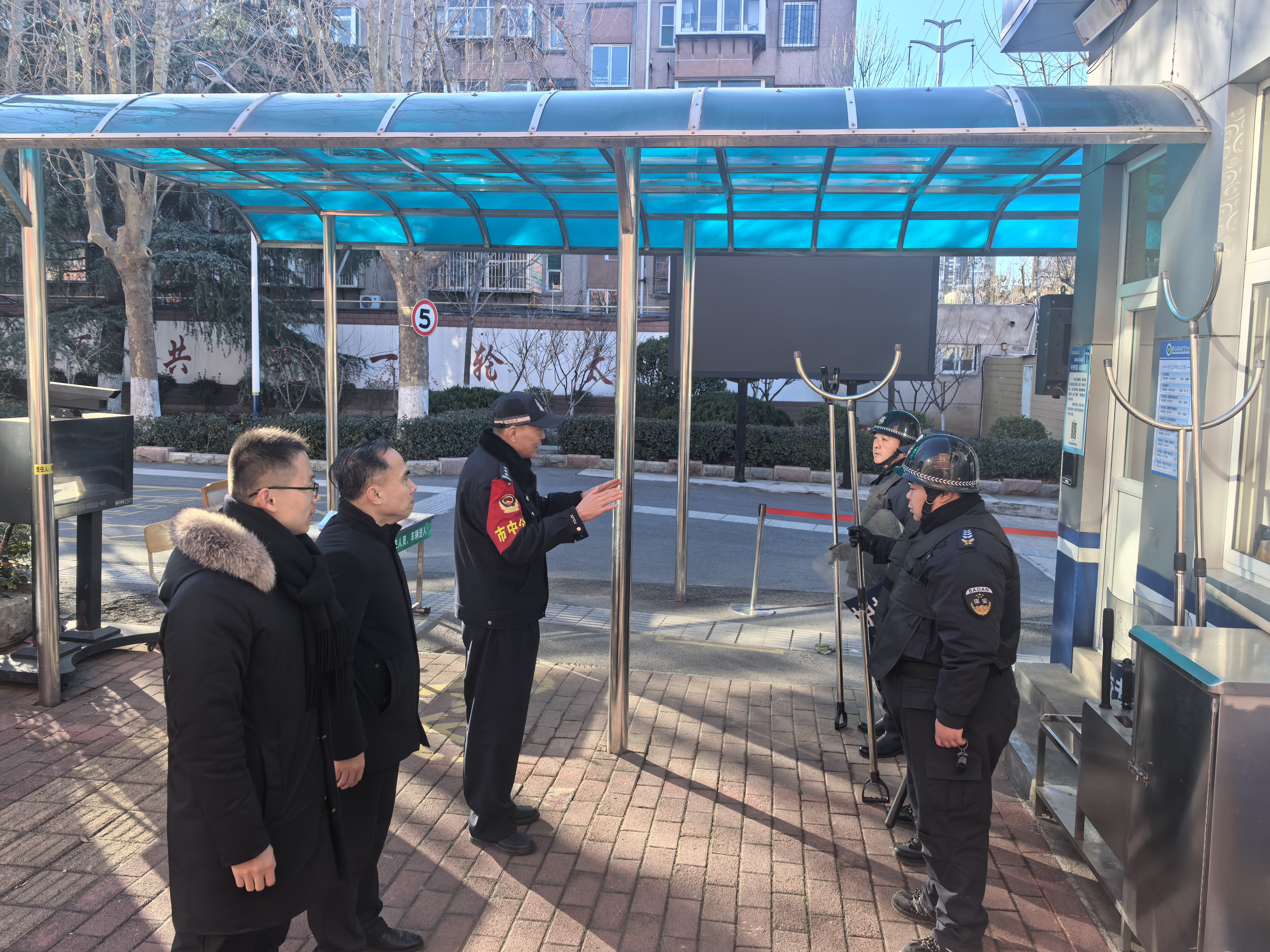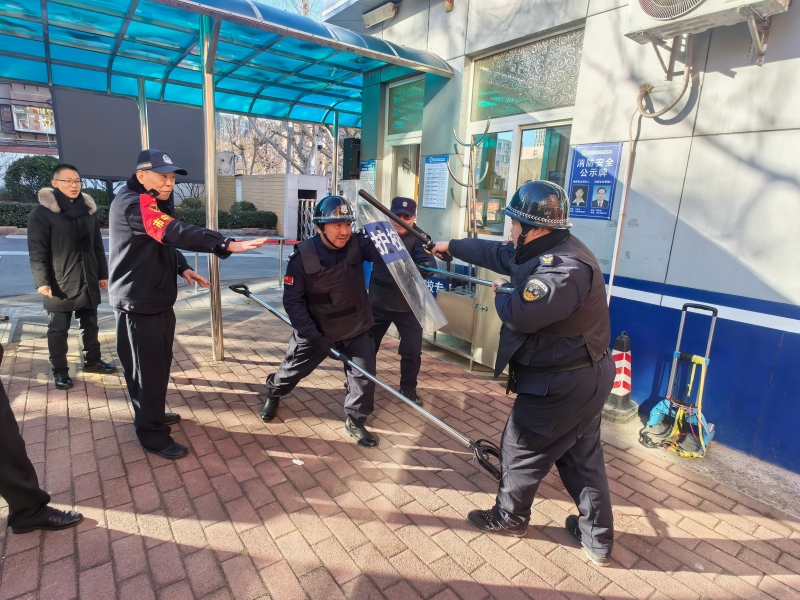 在反恐防暴应急处置环节,模拟“可疑人员”试图闯入校园,安保人员迅速启动最小应急单元,使用防暴器械进行拦截,并启动一键报警。在现场指导的郭勇警官对处置流程进行全程观察与评估,校方安保力量按预案迅速控制事态,有效保障师生安全。