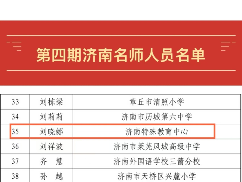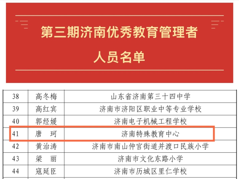 近日,济南市教育局公布第四期济南名师和第三期济南优秀教育管理者认定名单,经三年系统培养与严格届终考核,济南特殊教育中心副校长唐珂荣获第三期济南优秀教育管理者,刘晓娜老师成功获评第四期济南名师称号!