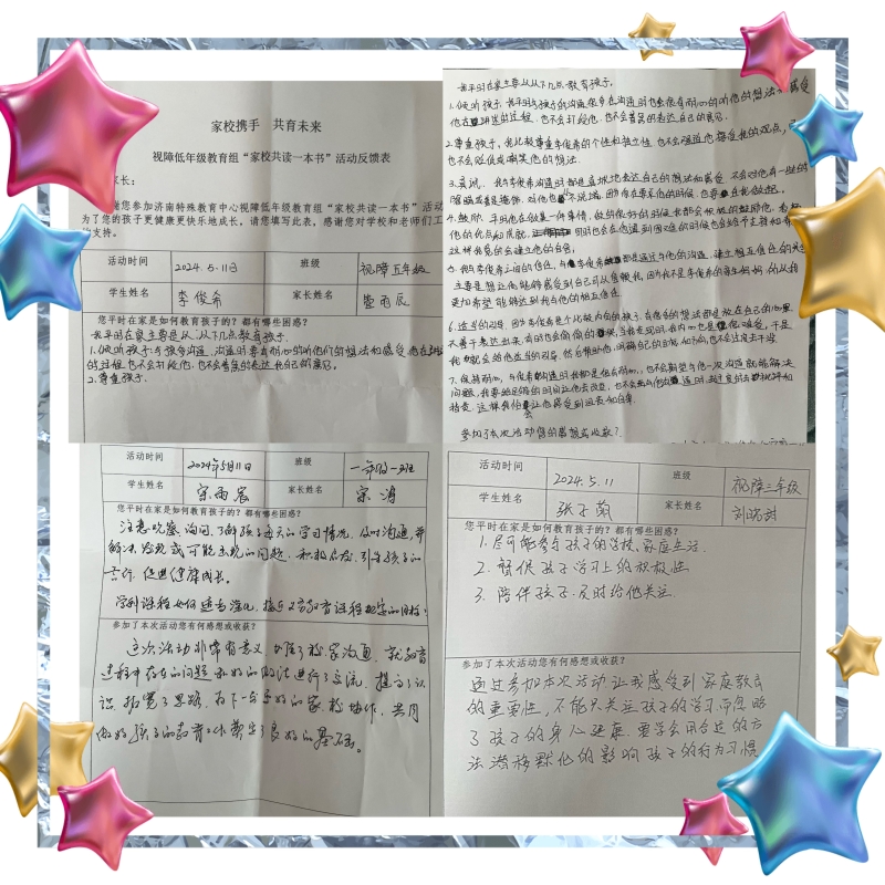 一本好书是一束光,点亮想象的世界;一本好书是一艘船,带领我们驶向辽阔的精神海洋。协同、凝心聚力,构筑家校阅读共同体,不仅能够积极推进学校阅读工程,提升学生、家长、教师的阅读素养,还可以提高家校育人能力,为视障学生的健康成长奠基。视障低年级教育组通过举行家校共读一本书活动赋能书香家庭、书香校园建设,帮助家长驱散教育焦灼,寻回自我成长的力量。