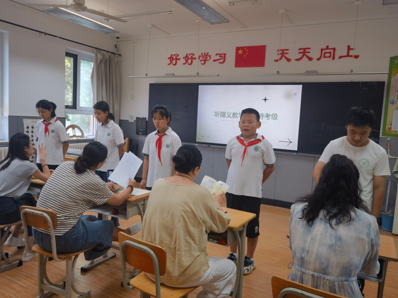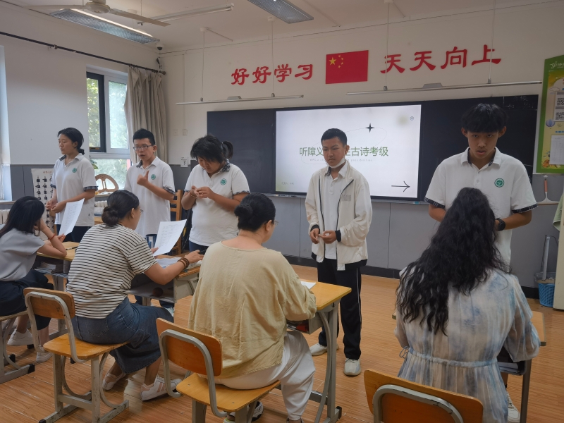 考级前,政教处制定了详细的考级方案,对考级工作进行了部署,听障义务教育阶段的班主任分组负责对学生进行诗词考查。